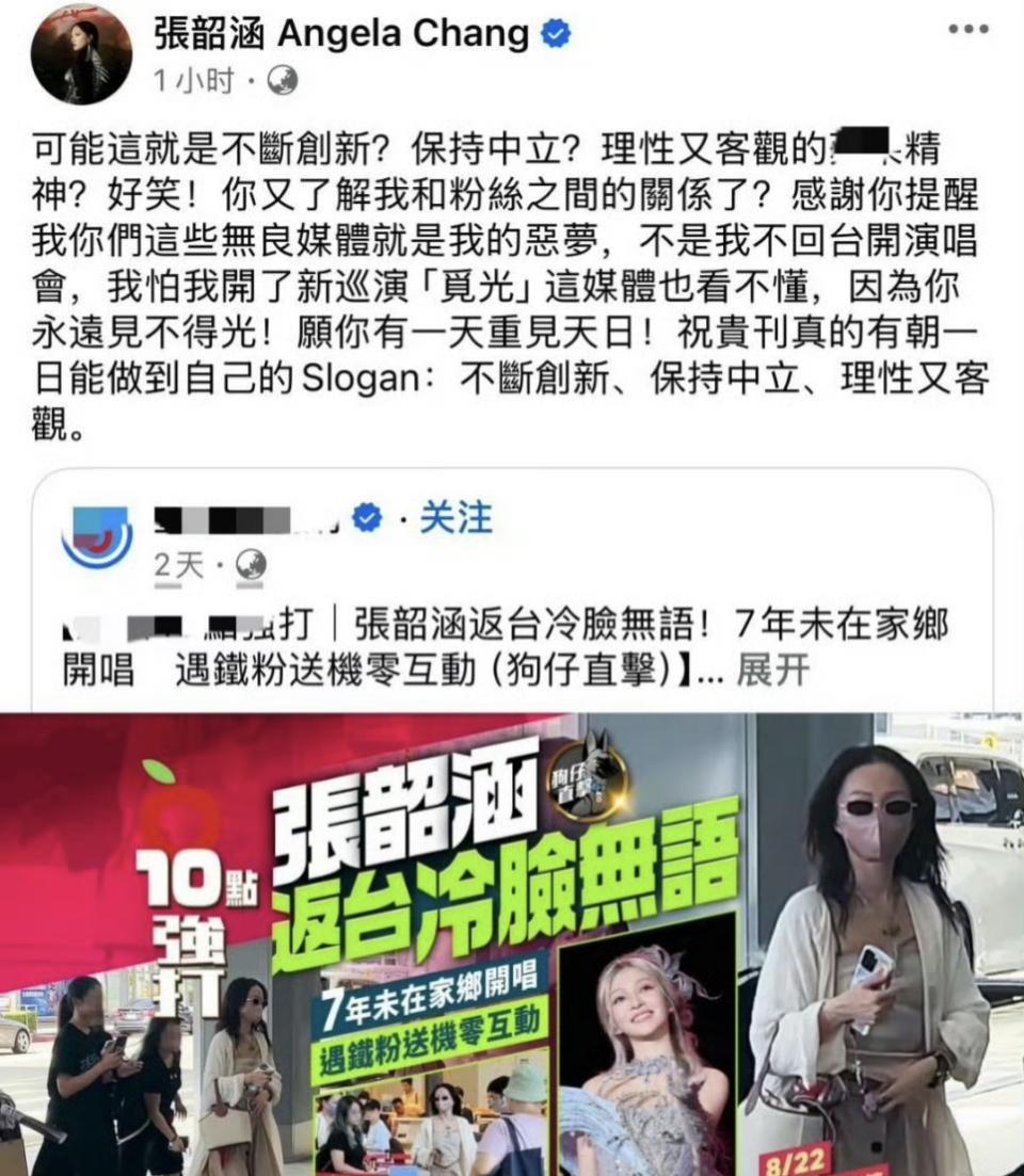 台媒《壹蘋新聞網》也是会“编”!8月26日拿张韶涵机场戴口罩墨镜的图,硬说她对粉丝“冷脸零互动”,还暗戳戳质疑她不回台开唱。 短短几句把不实报道怼得哑口无言,这嘴皮子,建议直接出道当“反黑达人”!#张韶涵#