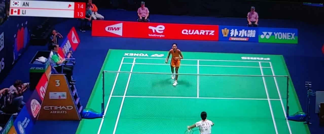 巴黎羽毛球世锦赛女单比赛,安洗莹对阵加拿大名将李文珊。 第一局,安洗莹