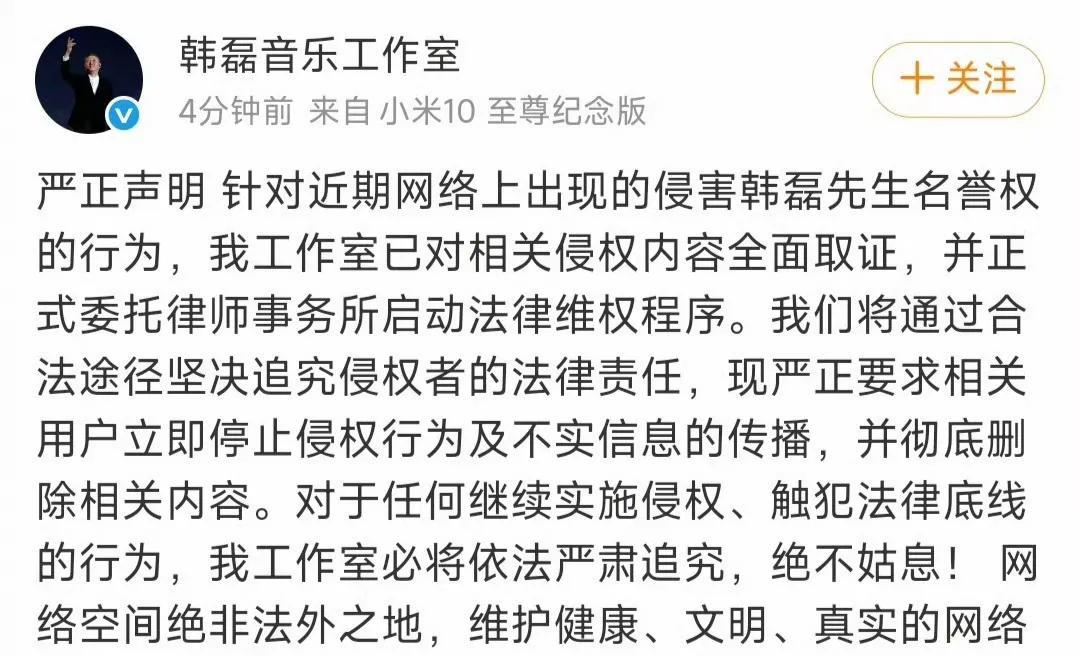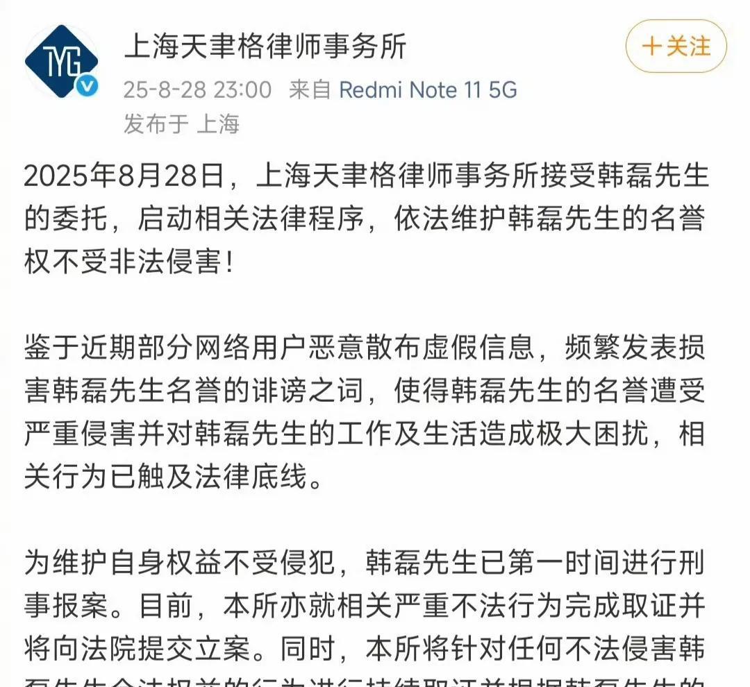 #韩磊妻子发布声明##韩磊妻子辟谣深夜连线相关# 韩磊妻子其其格发布声明回应谣言并追究法律责任。近日部分网络自媒体传播的“韩磊妻子深夜连线情感直播间”视频纯属恶意伪造,该行为严重侵害其权益。28日,韩磊先生就许某女捏造“怀孕拿走手机”等诽谤内容,已向北京通州法院提起刑事自诉,司法机关已受理。网络非法外之地,坚决维护名誉与法律底线,绝不姑息造谣行为。