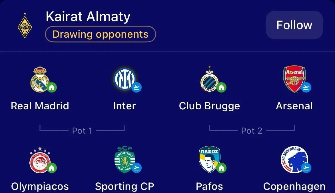 在点球大战中淘汰凯尔特人后,阿拉木图凯拉特成为历史上第二支打进欧冠正赛的哈萨克斯坦球队,由于地处中亚,欧洲球队随便一个来回都是5-6000公里。 在北京时间今天凌晨的抽签中,阿拉木图凯拉特跟皇马、布鲁日、奥林匹亚科斯、帕福斯、国米、阿森纳、葡萄牙体育和哥本哈根分在了一组,其中皇马、布鲁日、奥林匹亚科斯和帕福斯要经历长途飞行。 不过,最幸运的应该是葡萄牙体育,他们也抽到了主场对阵阿拉木图凯拉特。如果他们跟皇马一样客场作战就惨了,因为葡萄牙体育去往阿拉木图单程达到了6,135公里,往返更是超过12,000公里,这将成为欧冠历史上最漫长的客场之旅之一。 皇马去阿拉木图打客场据说就要坐11个小时的飞机,这样的赛程对于哈萨克斯坦和中国球迷是一个好消息,毕竟咱们离阿拉木图更近,比去伯纳乌看皇马踢球更省钱,到时候肯定有很多中国的皇马球迷去现场为主队呐喊助威。 当然更遭罪的是阿拉木图凯拉特自己,四个客场之旅才是折磨,不过能踢欧冠也是一种荣耀,付出一切都值了。再说了,欧足联也不会亏待每一支努力付出、奋勇直前的俱乐部。