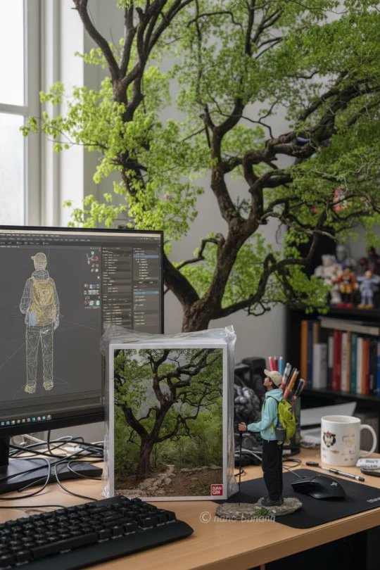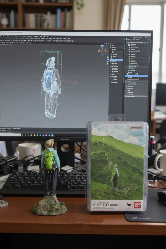 Use the nano-banana model to create a 1/7 scale commercialized figure of thecharacter in the illustration, in a realistic styie and environment.Place the figure on a computer desk, using a circular transparent acrylic base without any text.On the computer screen, display the ZBrush modeling process of the figure. Next to the computer screen, place a BANDAl-style toy packaging box printedwith the original artwork.