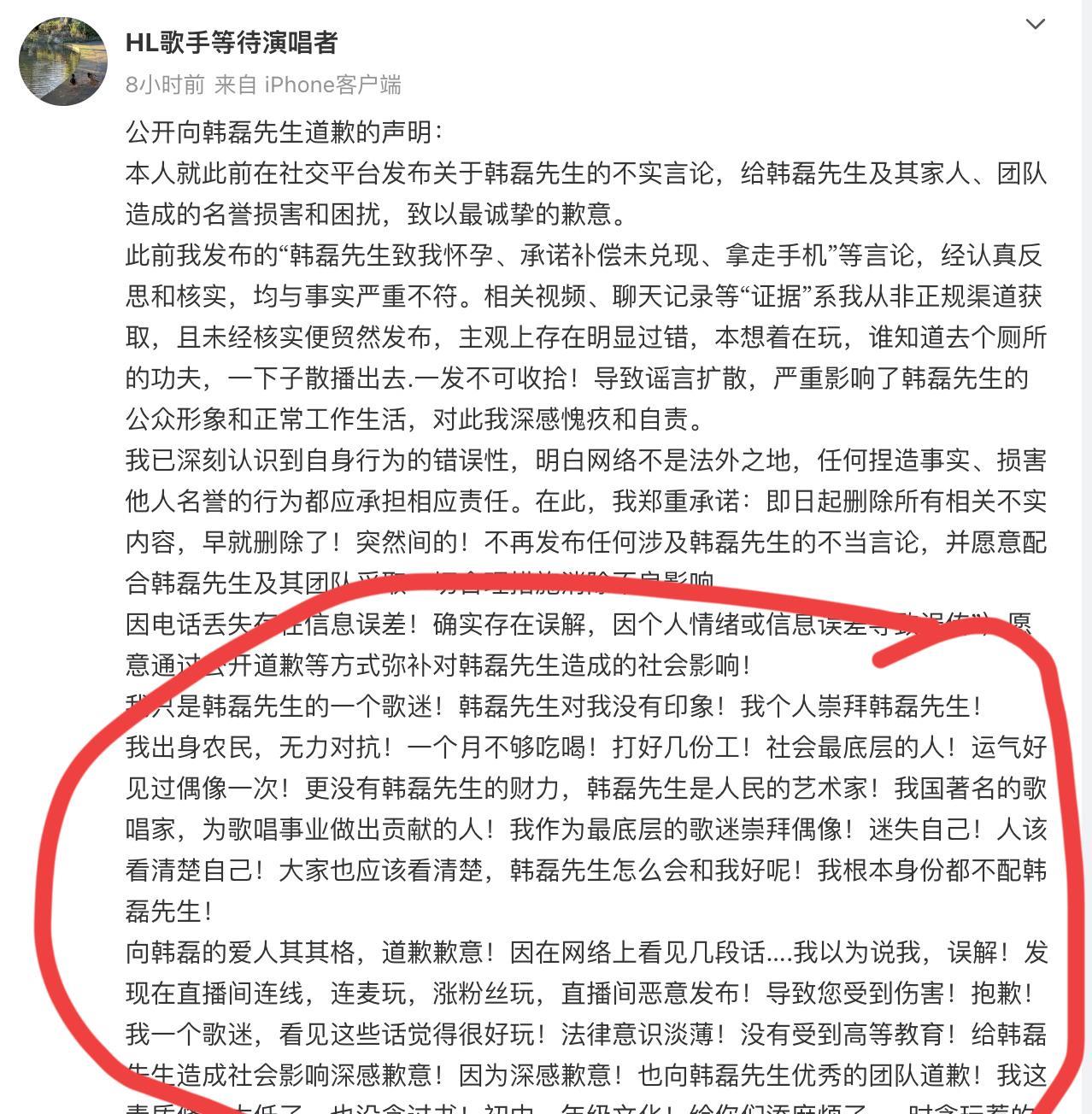 看了造谣韩磊的当事人道歉信, 有三点琢磨起来,很有意思。 一是,通篇写的前言不搭