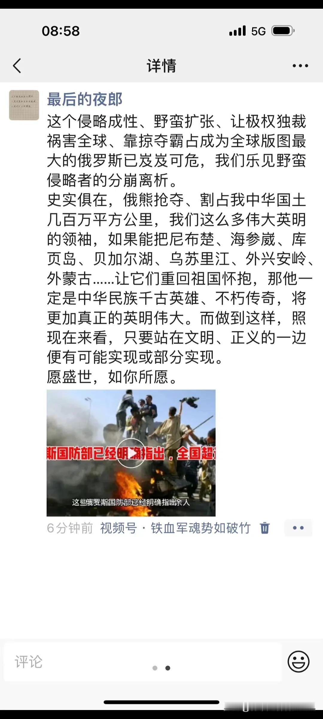 网络上,又有好多人为司机命丧钟,为普定喊口号。我不明白,为什么那么多人爱普定,而看看中国大小城市的街头,没有俄语,没有俄国的商店和公司,没有俄国的一丁点影响,不管文化、经济等方面,没有得到任何来自俄的学习和启示。反而,某些人眼里的仇恨之国(欧美日韩等)在国内的影响却依然还在。 如果侵略者可以胜利,那么世界没有天理,则侵略者胜利的那天,也是世界趋向黑暗的开始。 当我看到有孩子侵犯他人的玩具还振振有词,当有学生说“热爱普金”而且显得目中无人,当我看到现在的有些年轻人认为战争在生命之上、俄罗斯的扩张在世界和平之上时,哪怕阳光再明媚,我都心存悲凉。 是利字摆中间,道义放两旁?还是俄罗斯让人们欺凌弱小为虎作伥的本性愈加疯狂? 是天生对沙俄强权阿谀奉承,还是习惯了嘲讽弱者,视国际秩序为草芥? 2年前的侵略理由其实都已不攻自破,最终就是普某人的领土扩张野心而已。给他20年,带来一个落后20年的俄罗斯,同时带给世界一个蓄意领土恶意扩张及打着反美广告的某些集团(哈集团胡集团等)共同“协作”的全球化危害行经的“事业”罢了。 代价,就是普某人视如草芥的几百万生命,和他所在国家的没落。 最近,俄罗斯对于反对朝鲜核试验投反对票,公然支持核试验。 这样的人--- 侵略、核威胁、谎言、专制、迫害、征兵、发动战争(导致100万多生命损失以及严重的环境污染等)、支持哈马斯、支持核试验等活动,这样之人,在这里有那么多拥趸,还有一个姓单的安徽某商人(为了自己发战争财)在俄罗斯倾情拍侵略者国人之马屁,是非不分,还有其他大小v看到普某人“胜利”开心不已,真是苍蝇和臭虫凑在一起,恶相百出。 应该力劝的是饿人收手,而不是受害者投降,这才是我所认为的应有的立场。原则与是非不容妥协。