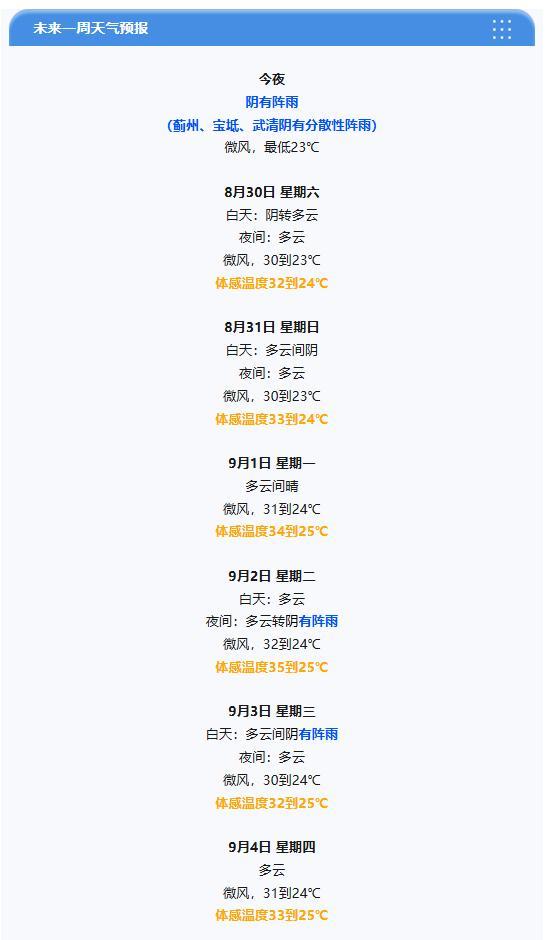 【周末阴天副本开启】今天下午天空云量逐渐增多,降雨光临津城,本次阵雨过程将影响全市范围,降雨将持续到夜间,且具有间歇性,预计明天(30号)早间,全市降雨结束降雨量1-8mm。周末两天,我市多云到阴为主,风力不大,市区气温在30-23℃。