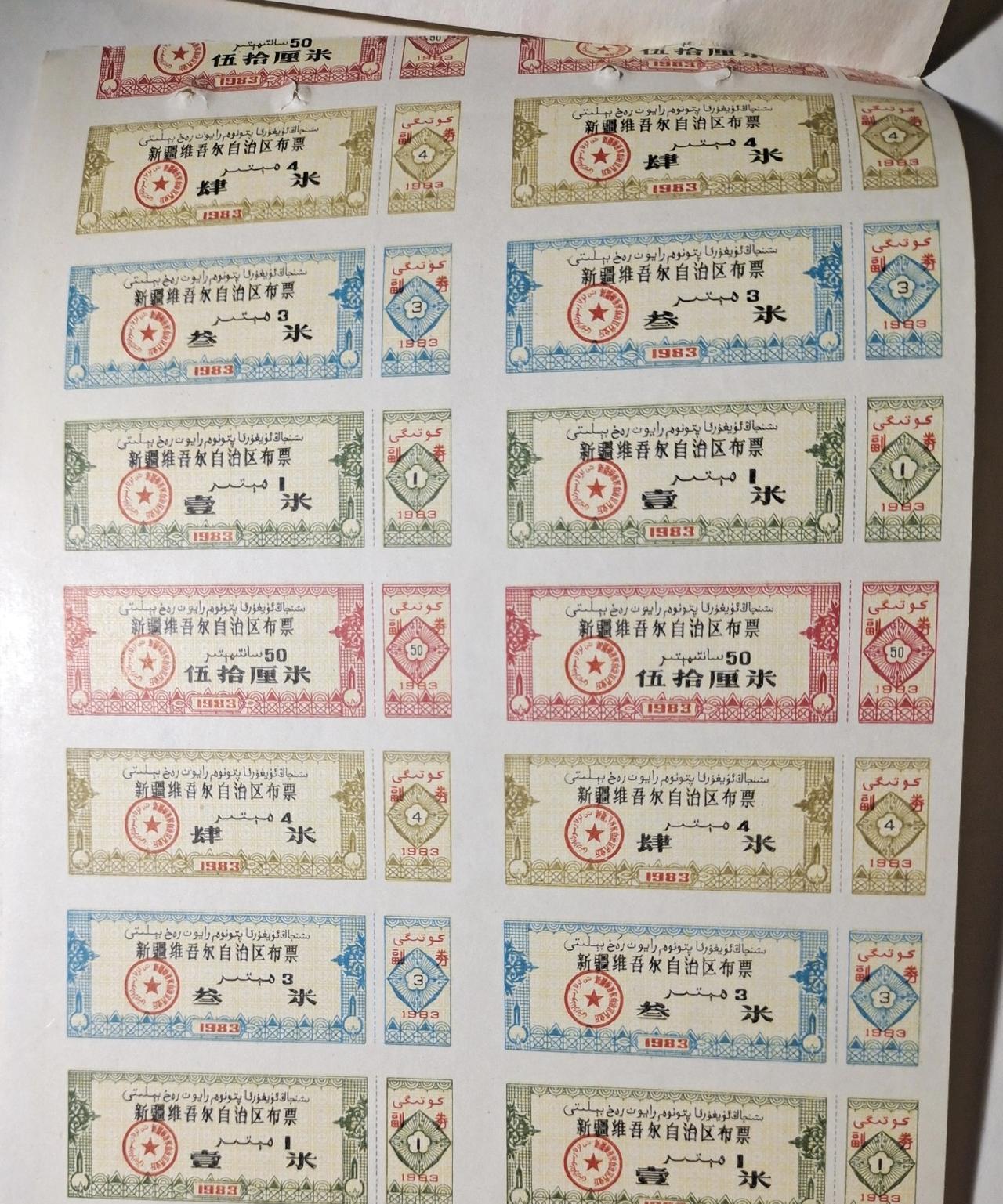 这是我收藏的上世纪1983年印制的新疆布票,共2大张,每张18面额不等的小票,共计36张小票。