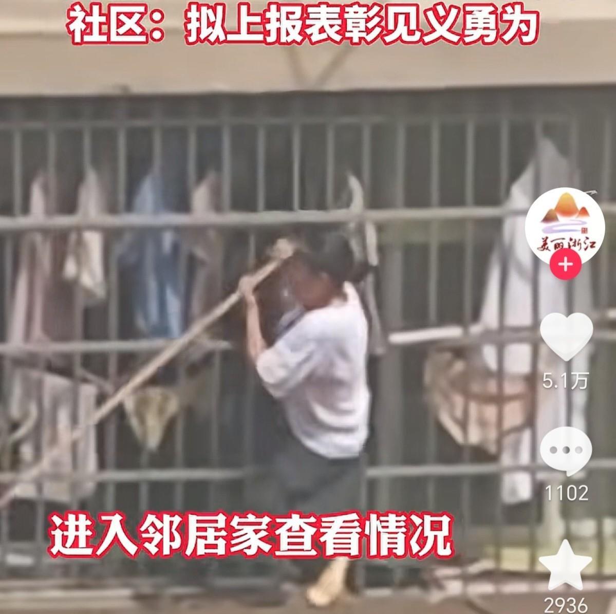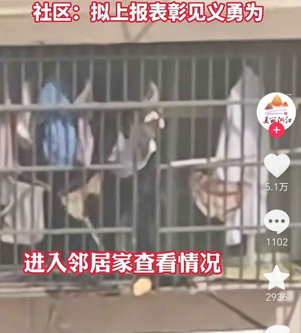 都说远亲不如近邻,老话诚不欺我! 近日,安徽安庆,一女子跟婆婆在家,突然发现隔壁邻居家的阳台着火了,邻居又不在家,眼看着火苗越烧越旺,虽然住在二楼,她还是当机立断的做了一个大胆的决定——从阳台的防盗窗爬过去灭火。 这栋楼是老房子,防盗窗的空隙比较大,还可以推拉开,这名女子从自家阳台爬过去,徒手抓住防盗网,她婆婆用盆装水给她灭火。 当时这名女子左手抓住了防盗网,右手接住水盆,却发现不顺手,水泼不到起火点,她又快速的换手,把水盆换到左手,泼了几次水才把火泼灭。看视频的时候,我真是心惊胆战,怕她换手时站不稳掉下去。 随后,这名女子拉开邻居家阳台的防盗网,进去邻居家里查看情况,火灭的及时,没酿成大祸。 真心觉得这女子太善良勇敢了,毕竟2楼也不低,人站在防盗网外面还是很危险的,如果不是她跟婆婆合力灭火,后果不堪设想。 社区打算给她申报见义勇为,我觉得挺好的,这是对女子的肯定,也能呼吁大家多做好事,莫以善小而不为。 (信息来源:美丽浙江)