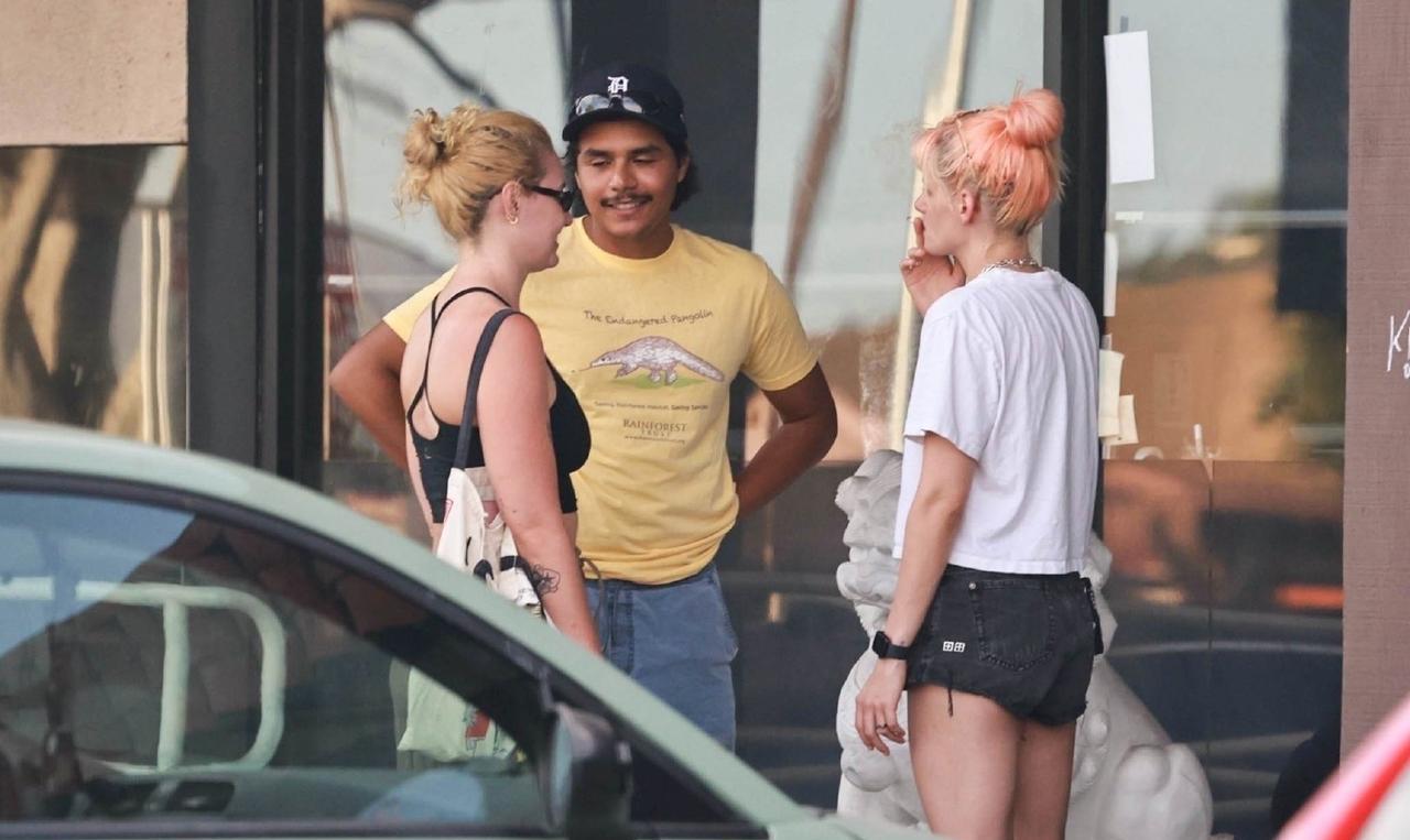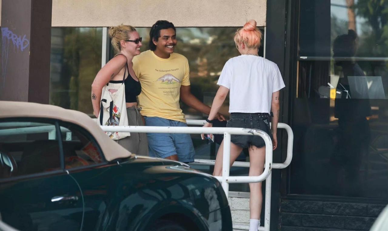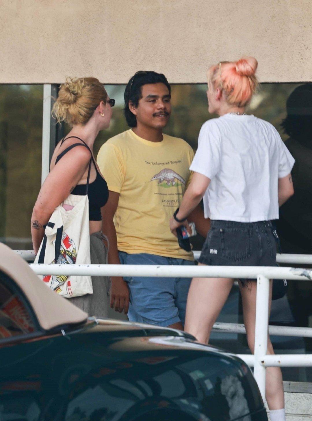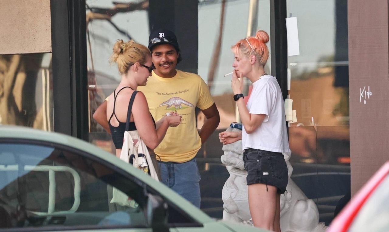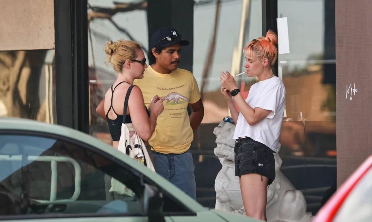 克里斯汀斯图尔特在洛杉矶外出,和朋友聚餐后在餐厅门口点烟聊天。