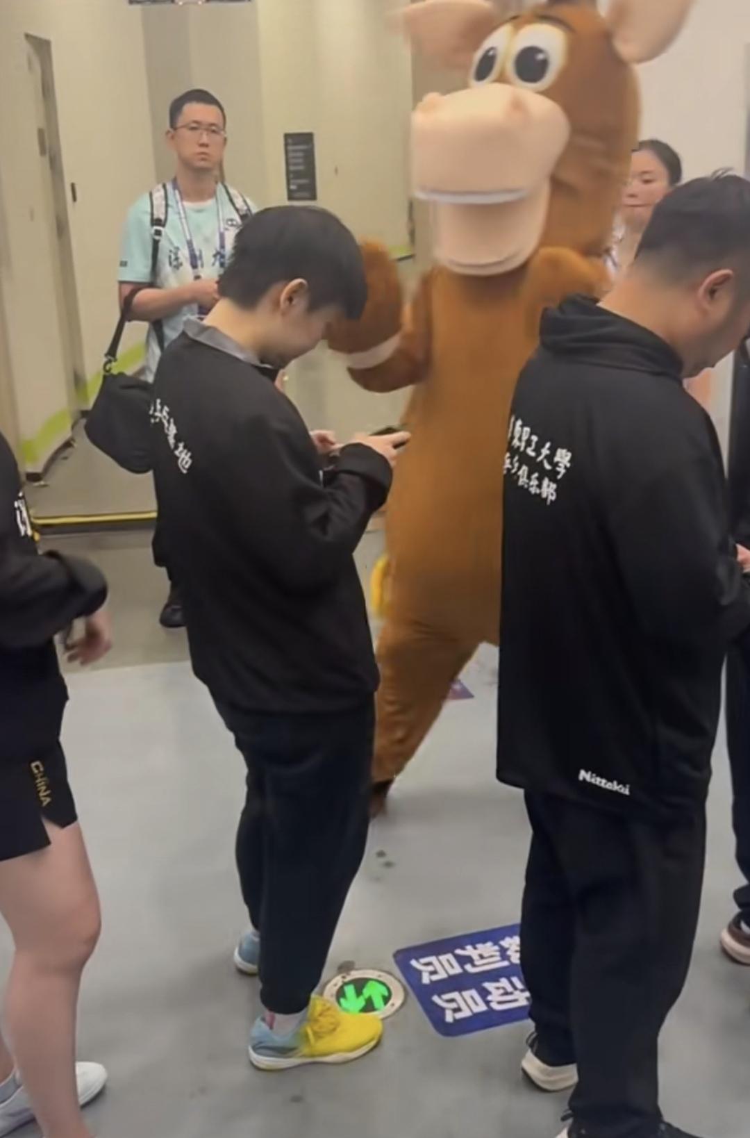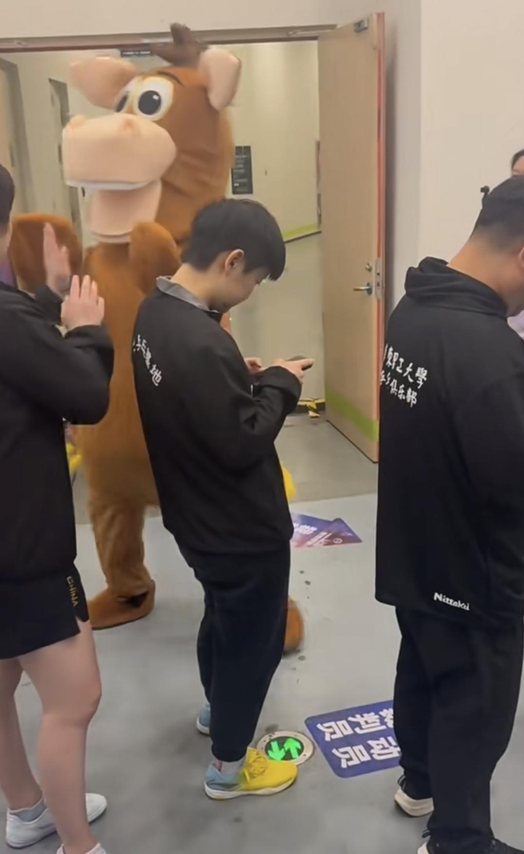 这是新疆特色吧,弄个小毛驴的人偶在候场区活跃气氛。 还跟运动员进行拍手互动。 只是莎莎一直在低头看手机, 没理会这个小毛驴。 莎莎今天跟蒯曼打了一场女双,3:1获胜,如果队友给力,莎莎第五场的单打可能就不用上了。