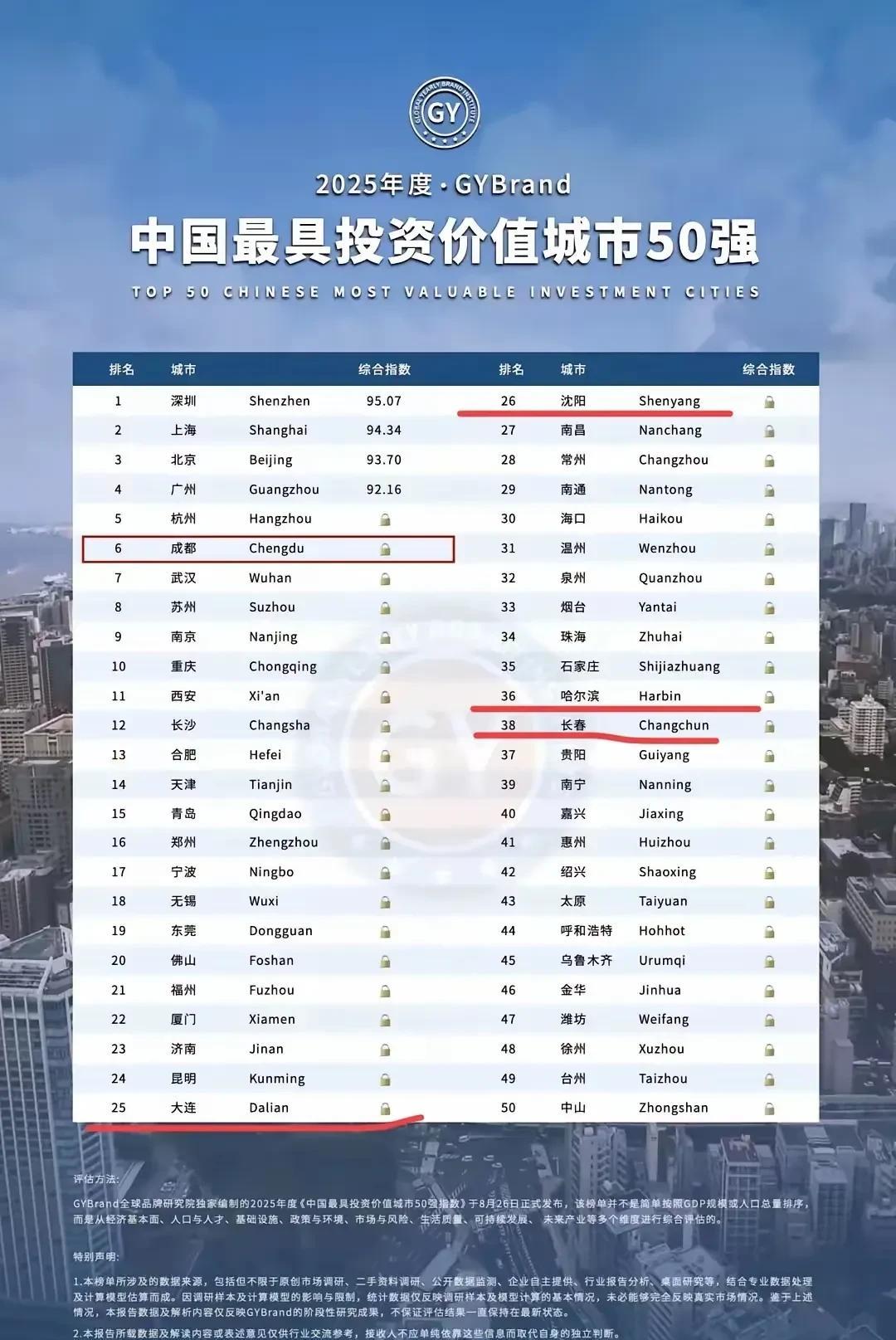 未来城市潜力50强榜单揭晓,东北“四雄”集体突围! 刚刚,有网友爆料一份榜单,国内未来城市潜力50强。沈阳、大连、哈尔滨长春赫然在列,名次远超多数南方城市! 这里,沈阳低空经济跻身全国前十 ,年底将联袂大连跨入万亿俱乐部。哈尔滨冰雪装备产业变身全球基地,长春新能源汽车产能翻倍不是梦? 如今,这场静悄悄的变革是东北人20年卧薪尝胆的积累。我们看到的不仅是城市排名的跃升,更是东北振兴新突破的决心。未来十年,东北能否重现"共和国长子"的辉煌?值得每个人关注!