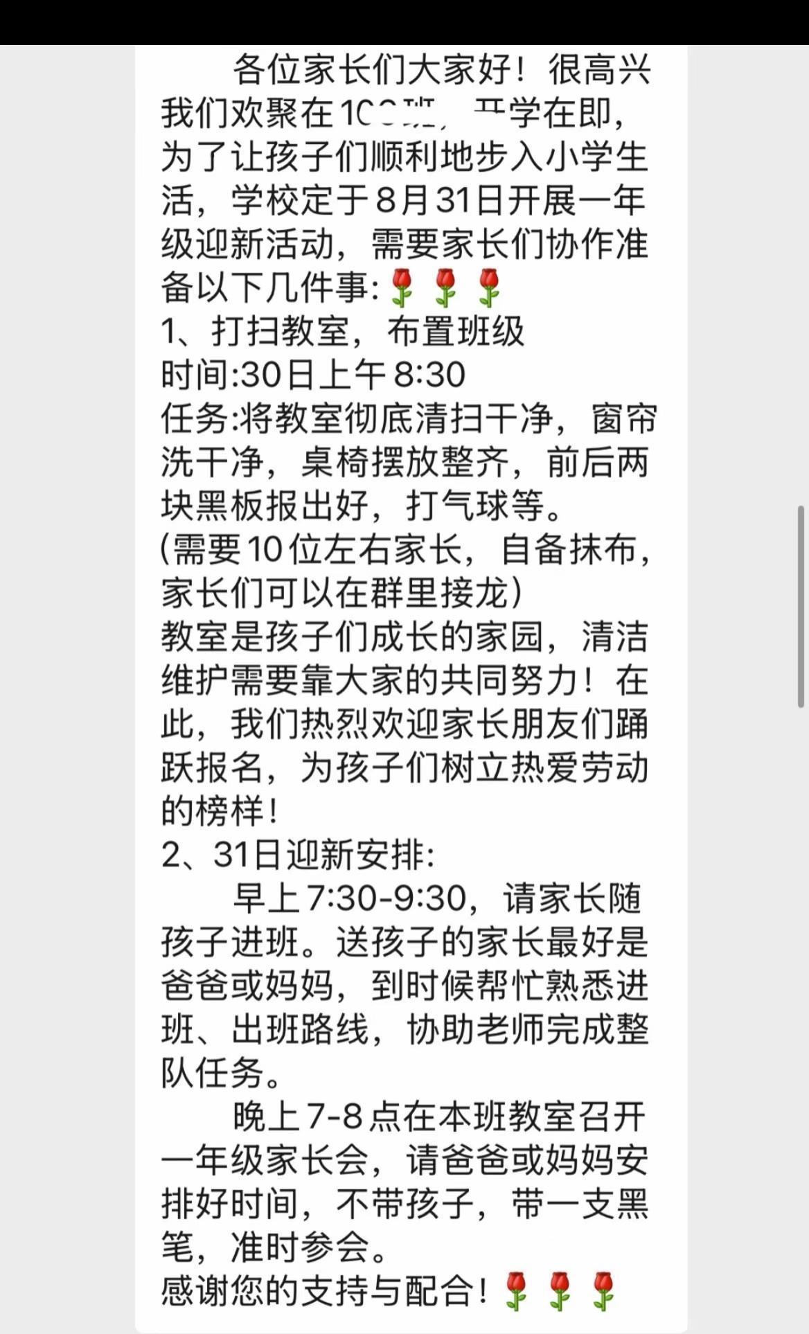 请问你们那里孩子开学前家长也做这些吗?打扫卫生、搬桌子凳子柜子,整理书本,不仅开学前要劳动,开学后每天放学还要轮班维持秩序。 现在的家长真的太难了! 他们小的时候后,这些活都是他们自己干,等他们当了家长,他们的孩子成了小学生,他们还要干。 每学期开学前老师都会在群里发信息说要求家长自愿报名参加劳动,还要求家长接龙。那报名的家长自然都是自愿的了,不是老师强迫的。 我在想,假如有的家长从来不主动参加这样的劳动,他的孩子在班里会不会受到不一样的待遇。 我要是现在的家长,估计我儿子要遭罪了,因为他上学的时候不用说参加劳动了,开家长会我都很少去参加的。