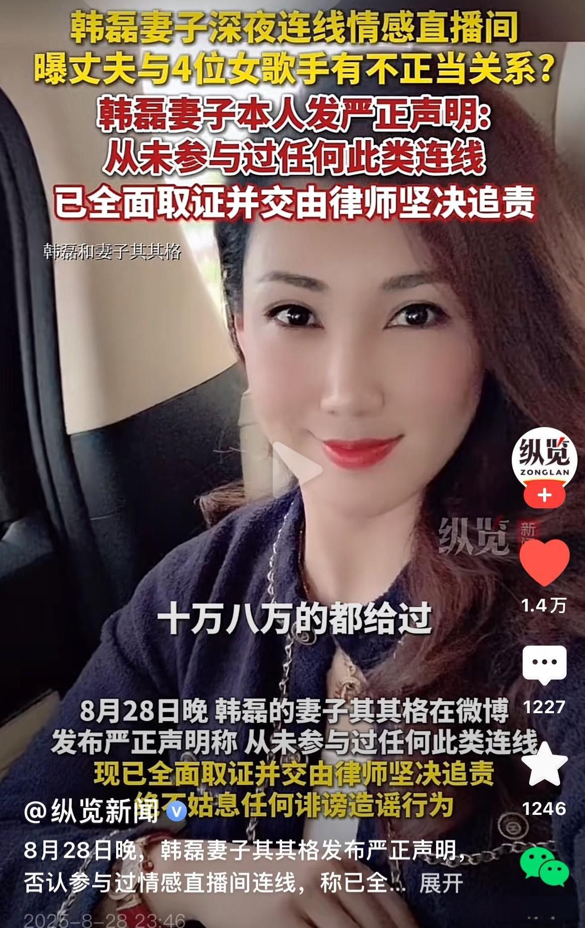 白瑞称,半夜有知名歌手的妻子连线她,说被她抓住的就有7个。白瑞确定就有4个,直播内容劲爆,据说都给了钱,有3万5万的,也有10万的。最后被引导的大众都怀疑韩磊。 韩磊妻子发声明,从来没连线过任何节目,已经保留证据,韩磊也要起诉某人,不知道真假。 韩磊时间已经很久了,各种连线版本很多,但是我一直都认为不是他本人,有合成的可能。