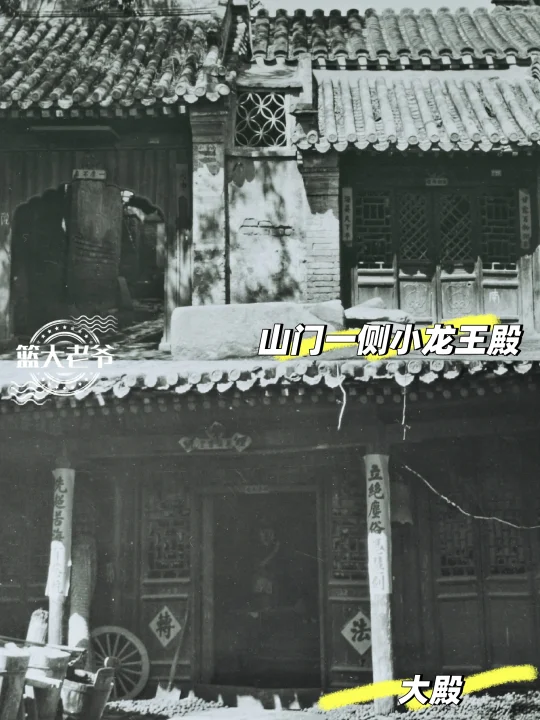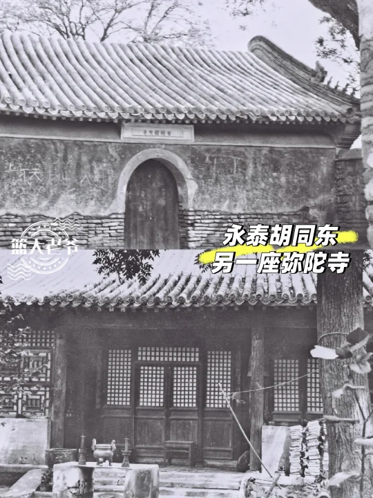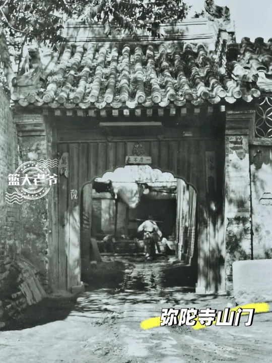 8️⃣新街口南大街弥陀寺(在西北侧永泰胡同东侧和三官庙胡同、今西章交口还有一座,大致在如意里东区,名古刹弥陀寺),此寺紧邻南大街龙王庙,明嘉靖朝建,初名龙泉寺,清康熙69年,六科五城兵马司于此设坛贺圣寿,乾嘉后更名报恩弥陀寺。山门东向,内有甜水井一,悬寺匾五间西殿为嘉庆五年重修,内供泥塑金身阿弥陀佛与二侍者,两厢分立达摩与关帝土地泥塑,明万历铁磬一,清末之后,此寺为宫门口慈因寺的下院,民国调查记录未提及此寺供过龙王,传有王姓山东水夫租用寺中水井卖水为生,并在井窝子后建一间龙王小殿,等于此寺的井龙王是后迁入的。看旧影山门一侧小殿楹联写的甘露百物润,海晏天下平,横批风调雨顺,应该就是小龙王殿,那等于井就在山门前,另一张壶门里正好有位水夫,大殿隐约可见一侧神像身量不小。慈因寺以前整理过,尚有建筑石树遗存。