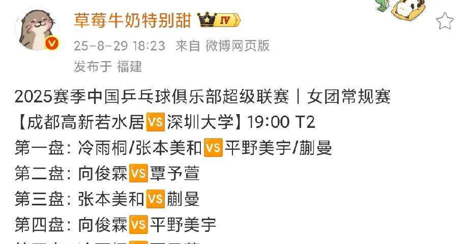 哈哈还真猜对了,莎莎还真不上场 蒯曼和平野美宇双打, 覃予萱一单, 平野美宇二单, 蒯曼三单, 挺好蒯曼对战成都若水居的三单张本美和,让蒯曼碰碰有好处。 莎莎可以安安生生观赛和场外指导。 目前第一盘双打,前两局平野美宇/蒯曼2-0(11-8、11-6)领先张本美和/冷雨桐。 深大加油!
