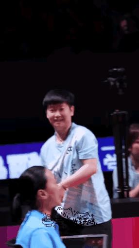 乒超新疆这一幕, 再次证明莎莎是用脑子打球! 深圳大学对阵黄石华新, 莎莎分别是第一、五盘, 跟蒯曼配对赢了第一盘, 第二盘是覃予萱对姚睿轩, 第五盘是孙颖莎对姚睿轩。 莎莎坐在场外(图一图二), 盯着覃予萱和姚睿轩, 姚睿轩是她的小师妹, 莎莎回河北两个人会对练, 姚睿轩跟覃予萱的对阵, 我们看的是谁输谁赢, 莎莎看的则是门道, 做到心中有数上场。 果然, 11-3,11-4连下两城, 姚睿轩第三局连连追分, 也难以挽救失败的结果。 赛后姚睿轩找莎莎握手, 莎莎笑嘻嘻地跟师妹打趣, 颇有点大姐姐训话的意思: “接发球再往下一点”!(图三) 估计小杨听了也挺开心, 知道替他带师弟师妹了~[比心] #记录真实生活#