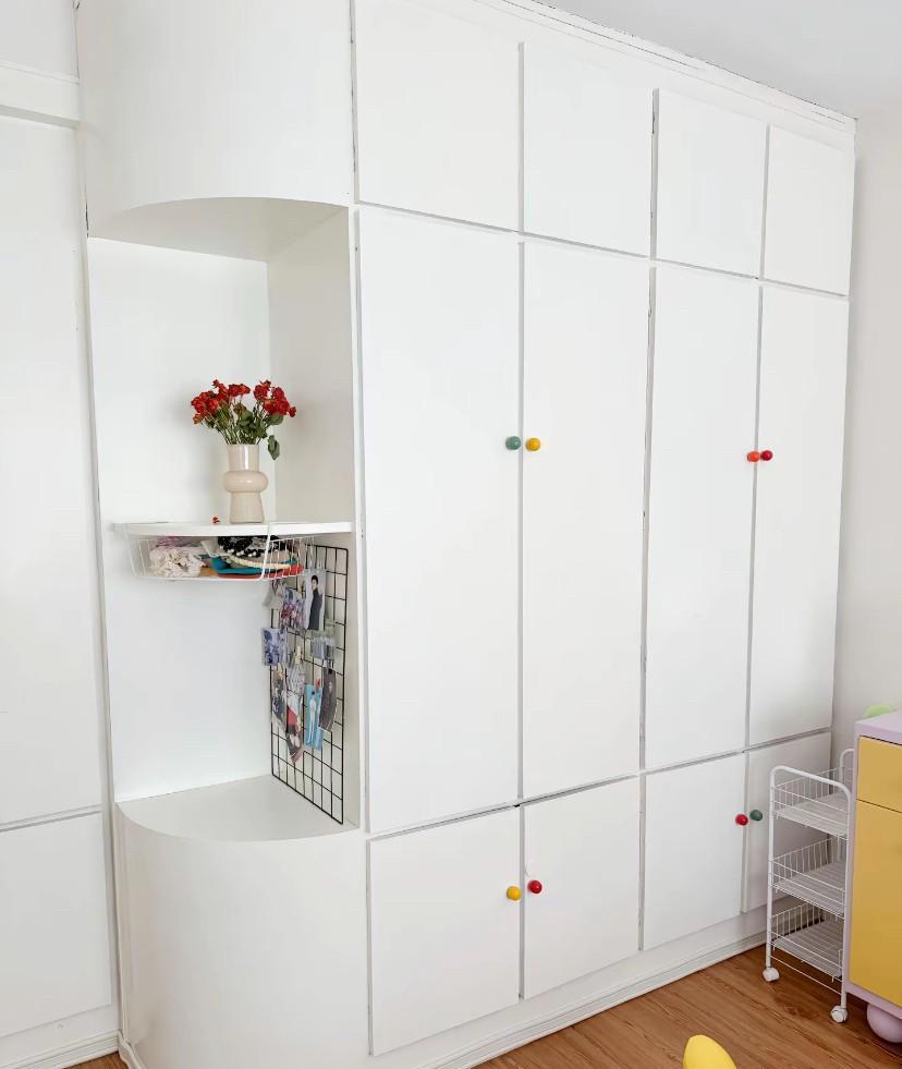 我爸家这老柜子用了10几年了,这几天找师傅把颜色给刷成白的的了,顺便把地面铺了一
