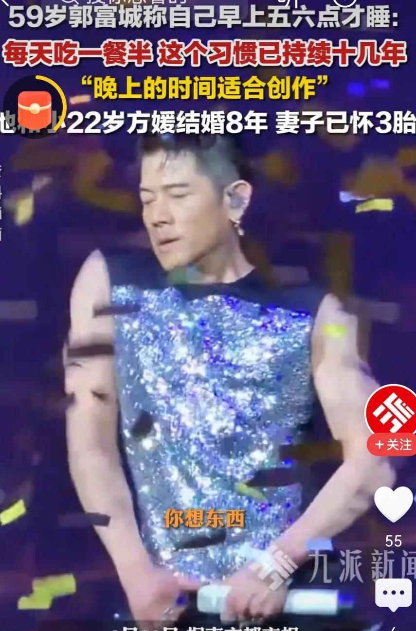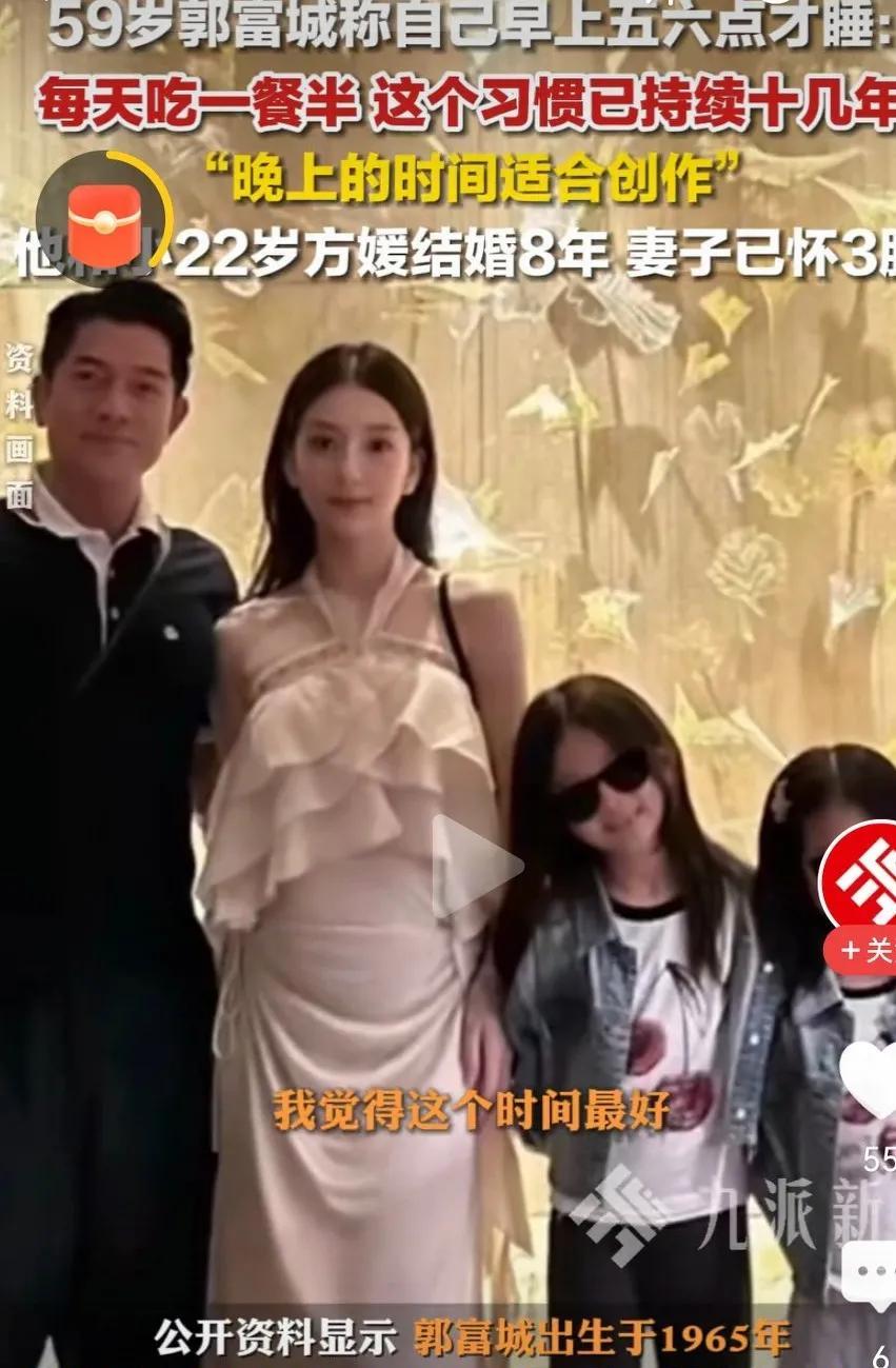 郭富城称每天早上五六点才睡 即日,59岁郭富城在访谈中透露,自己十几年坚持凌晨五六点入睡,每日仅吃一餐半,称“夜间灵感充沛利于创作”。其妻方媛38岁,此前已诞两女,今年6月郭富城曾官宣三胎喜讯。网友笑问:“作息颠倒,还能和妻子同框吗?”