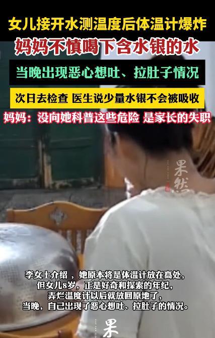 “悲剧还是发生了!”江西萍乡,一女子将体温计放在高处,不料,被好奇的女儿拿出来量热水温度,爆炸后女儿将体温计放回了原处,女子却毫不知情的喝下了有水银的水!很快她就开始上吐下泻,所幸女子的摄入量并不多,并没有生命危险。网友:漏风的小棉袄! 小孩子好奇心强,对于外界的一切事物都感到好奇,然而,这也很容易发生意外,所以家长一定要提前告诉孩子,什么东西千万不能碰。 据媒体8月30日的报道,当时女孩找到了一根体温计,她想测量下热水的温度,就倒了一杯子水,然后将体温计插了进去,毫无疑问,发生了爆炸! 女孩担心被妈妈责备,急忙将破损的体温计放回了原处,但是杯子里的水并没有倒掉。 女子就这样喝下了“毒水”,并且很快出现不适症状,女子急忙前往医院检查,结果发现时“汞中毒”,还好她只是喝了一点水,不然症状就严重了。 女子回家后,给女儿讲了水银的危害,女儿听后意识到了自己的错误,连忙给妈妈道歉。 水银这东西一般不会被人体吸收,可以通过喝牛奶的方式来缓解症状。 网友看后表示,孩子好奇是好事,但不能什么东西都让他们碰,不然真的太危险了。 信息来源:《体温计被弄坏女子喝下含水银水》齐鲁壹点