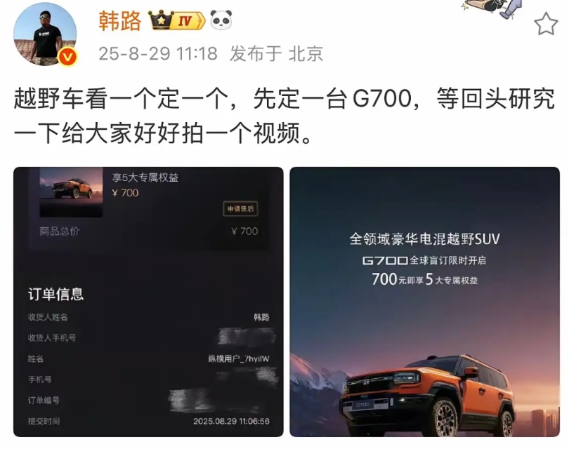 现在的车评人也太有钱了,刚刚上市的捷途G700,韩路就直接盲定了一辆,那到底是先
