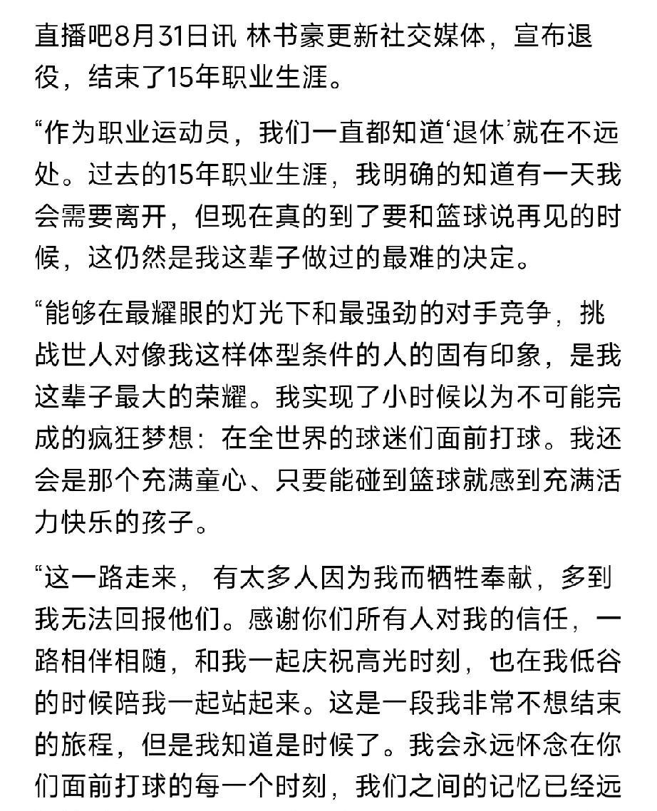 林疯狂发长文宣布退役,结束15年职业生涯! 就在刚刚,曾经轰动整个NBA的亚洲小子林书豪,后凭借自己一连串的惊艳表现赢得尊重,被称为“林疯狂”!成功在NBA立足,回想起林疯狂那段时间,真的不得不让人感叹,机会是留给有准备的人,但机会没来的同时要时刻做好准备! 时光荏苒,岁月如梭,林书豪已经37岁了,真的让人感叹! 林书豪发长文告别15年的职业生涯,开启人生新篇章,他自己回忆了过往,描述退役的心情,很真诚。 林书豪退役长文如下图。