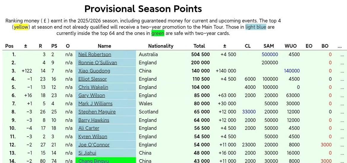 肖国栋夺得武汉公开赛冠军后,斯诺克单赛季排名发生变化: (单位:英镑) 肖国栋收