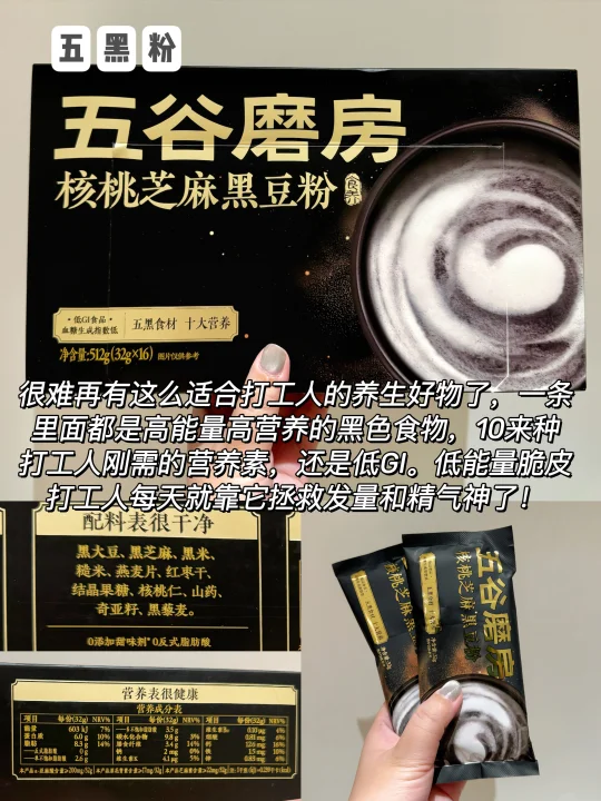 分享过多次啦,真的很难再有这么适合打工人的养生好物了,一条里面除了高能量高营养的黑色食物,还有10来种打工人刚需的营养素,低能量脆皮打工人每天就靠它拯救发量和精气神了!早上跟咖啡牛奶兑一起,就是一杯熬夜人提神醒脑的营养早餐,下午茶或者加班拌个酸奶,就是一个低卡抗饿美食。