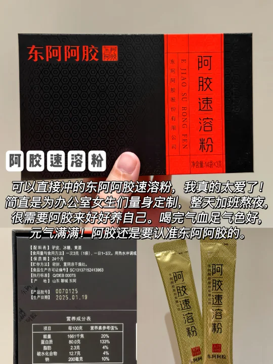 可以直接冲的阿胶速溶粉,我真的太爱了!简直是为忙碌的办公室女生们量身定制的,整天加班熬夜各种卷,很需要阿胶来好好的养自己。这种一冲就溶的阿胶放在办公室,随时热水冲一杯或者牛奶冲一杯,喝起来带着淡淡的胶香,比奶茶还要好喝养生,气血充盈气色也好,整个人也元气满满!配料表也超级干净!