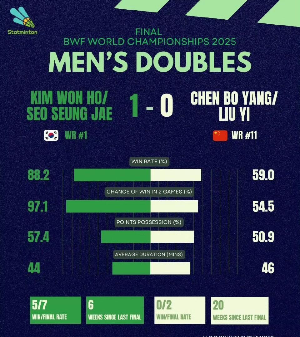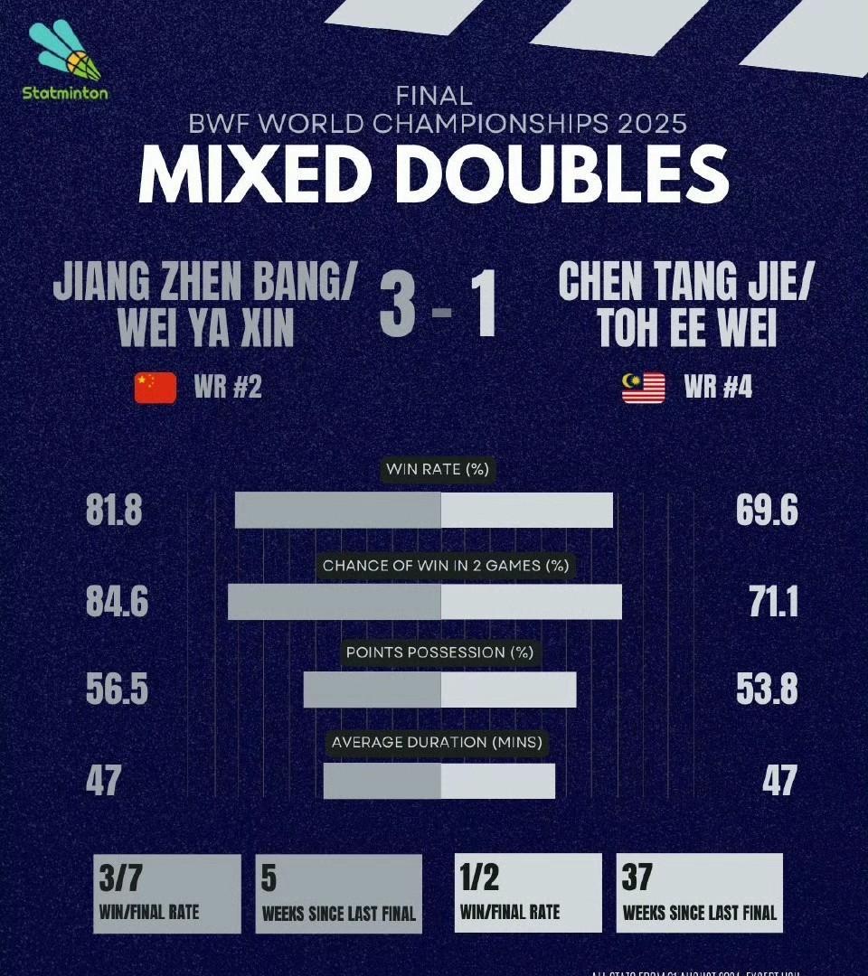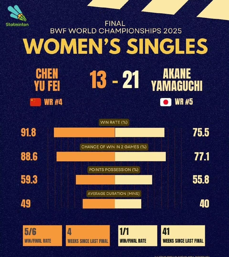 其中,胜率最高的是陈雨菲,平均比赛用时最长的是石宇奇。最近一次打入决赛的是陈雨菲(距离上一次打入决赛相隔4周),最久一次打入决赛的是山口茜(距离上一次进入决赛长达41周之久)。石宇奇、昆拉武特、山口茜分别保持着100%决赛胜率,仅有一百分组合决赛胜率为0。 以上数据统计自2024.8.31起(不包括本站)。 #2025年羽毛球世锦赛##国羽世锦赛全项目晋级决赛##记录我的2025#