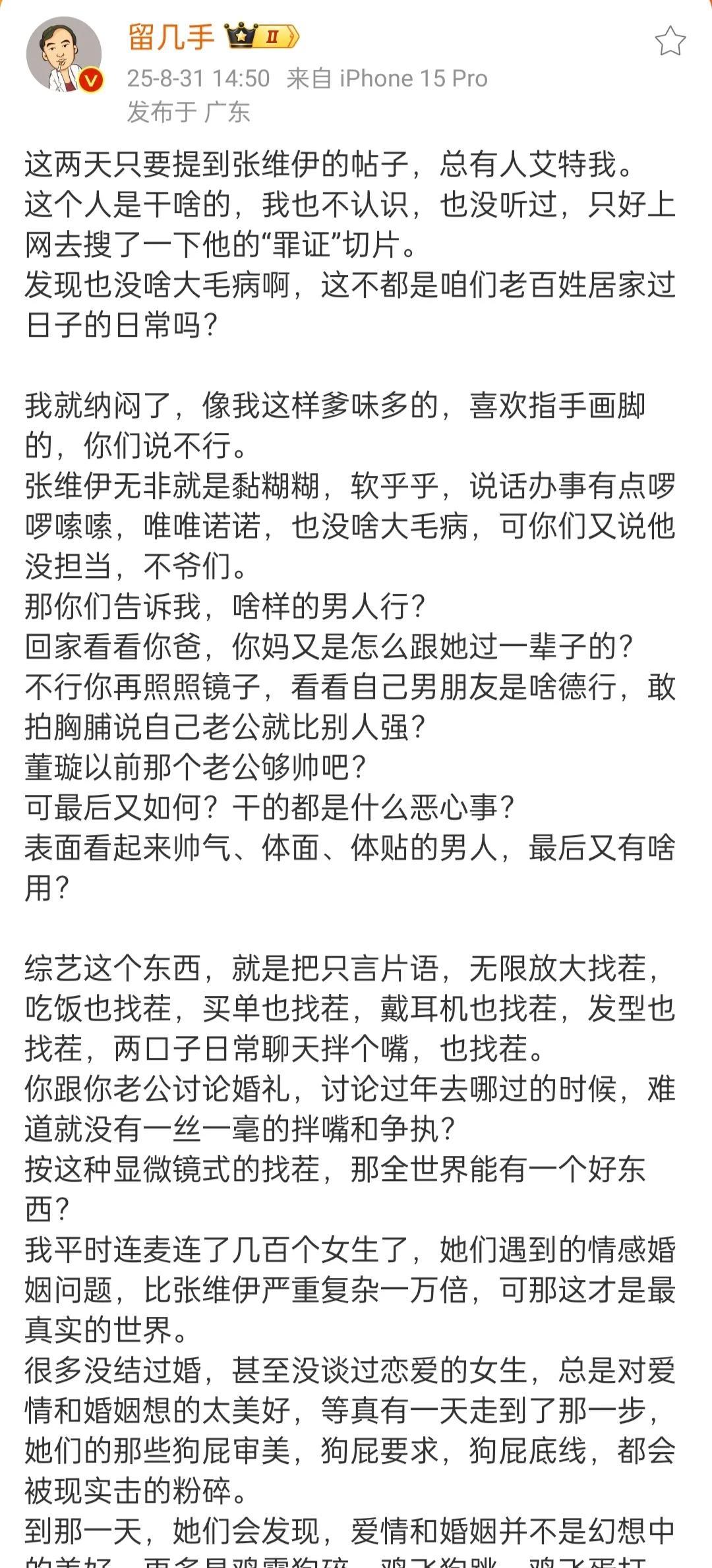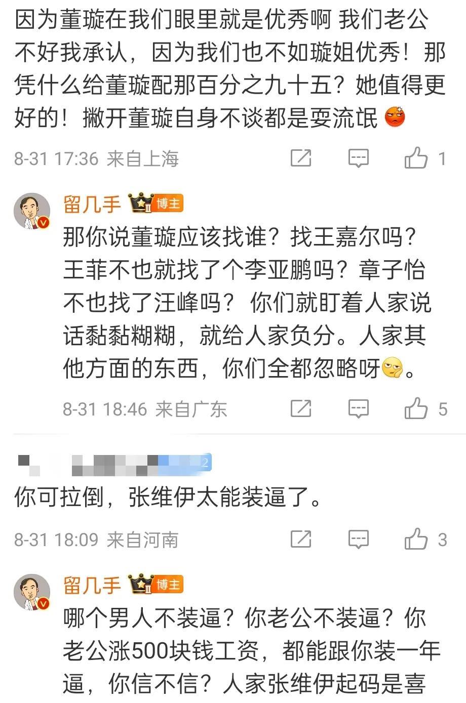 张维伊终于遇到除了董璇以外,第二个欣赏他的人了! 刚刚留几手发长文为张维伊发声,称张维伊除了有点啰嗦,唯唯诺诺,别的没啥大毛病,已经超过了90%的男人了! 留几手在线和网友对线,让网友看看自己老公什么德行,反问网友董璇以前那个老公够帅吧,可最后又如何? 张维伊看了不得感动哭,留几手这也太犀利太敢说了,不过话糙理不糙,留几手有些观点也不无道理!#娱乐# #明星#