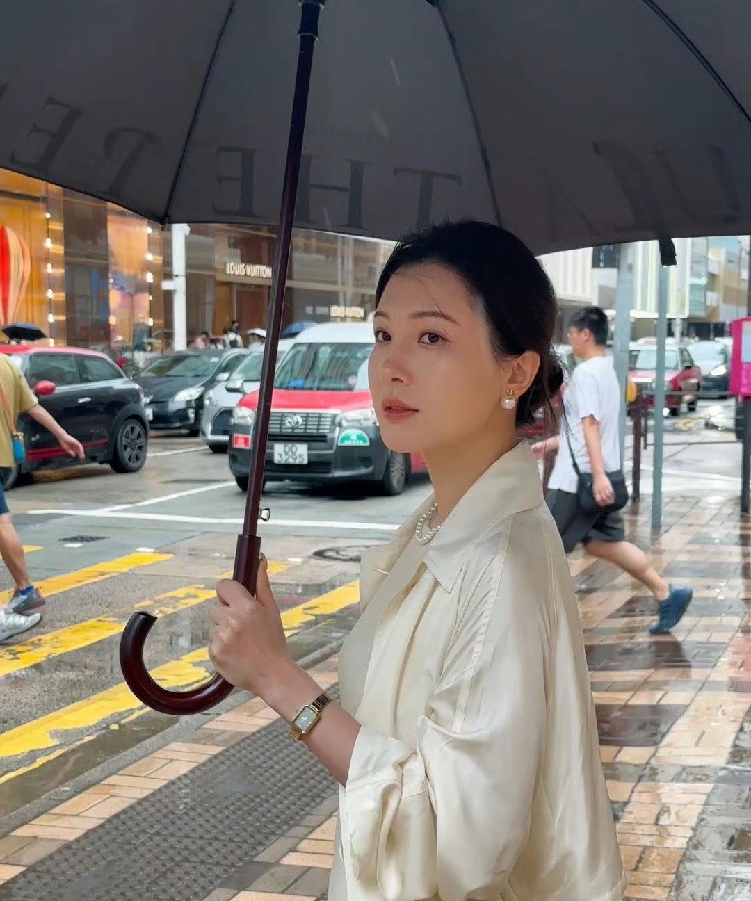 米色裙裾衬着珍珠光泽,黑伞在都市街景里撑开一方静谧,步履间尽是从容优雅的气息,仿佛把时光都过成了细腻的诗。