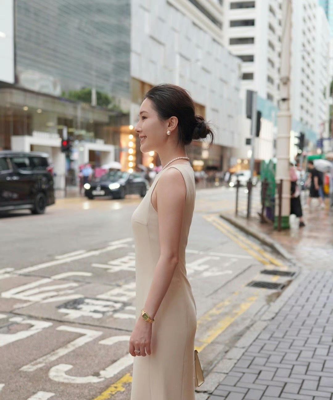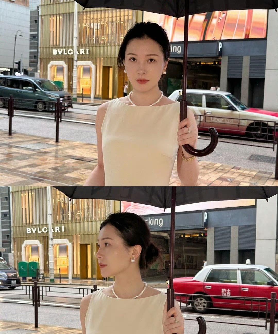 米色裙裾衬着珍珠光泽,黑伞在都市街景里撑开一方静谧,步履间尽是从容优雅的气息,仿