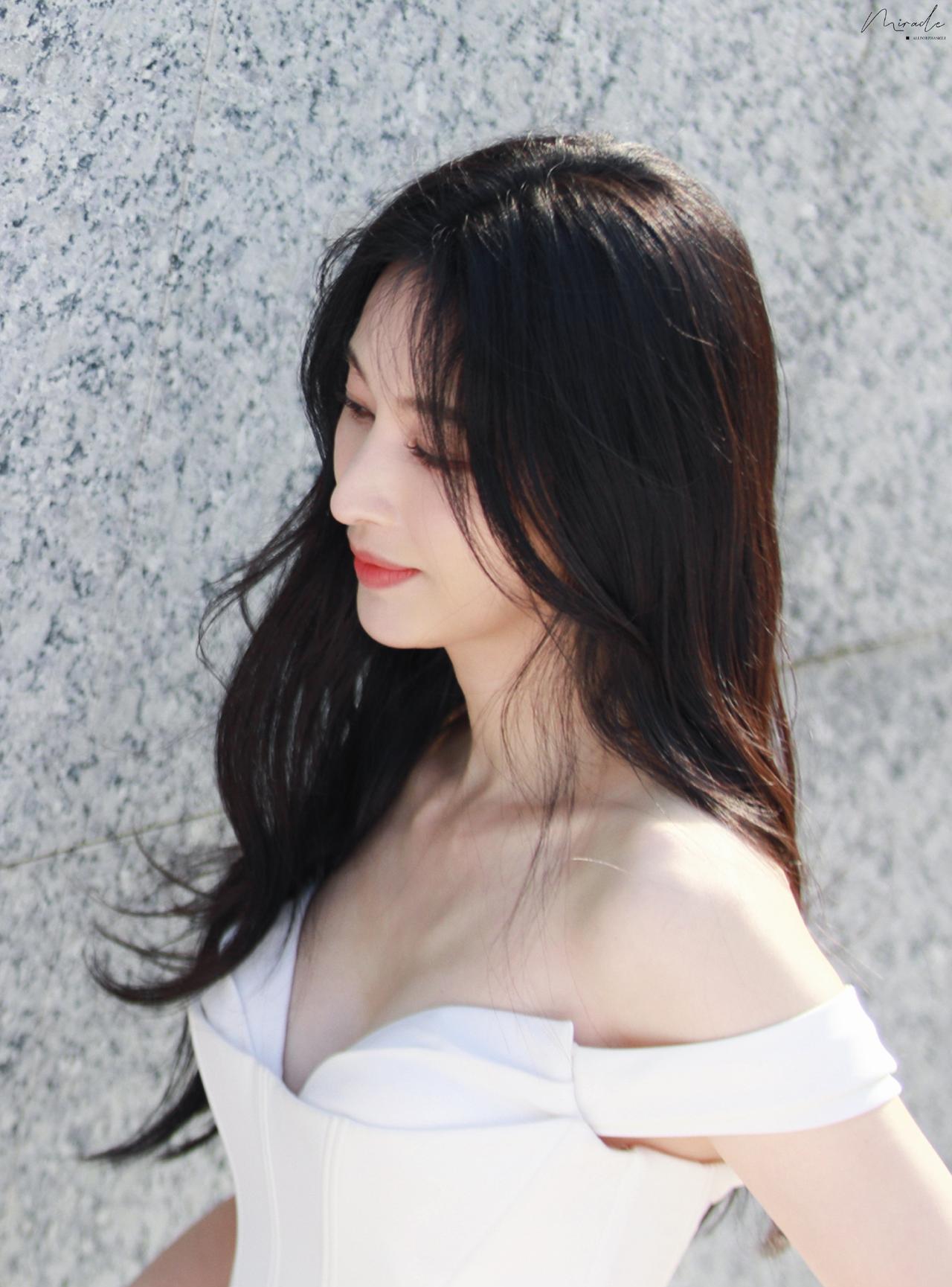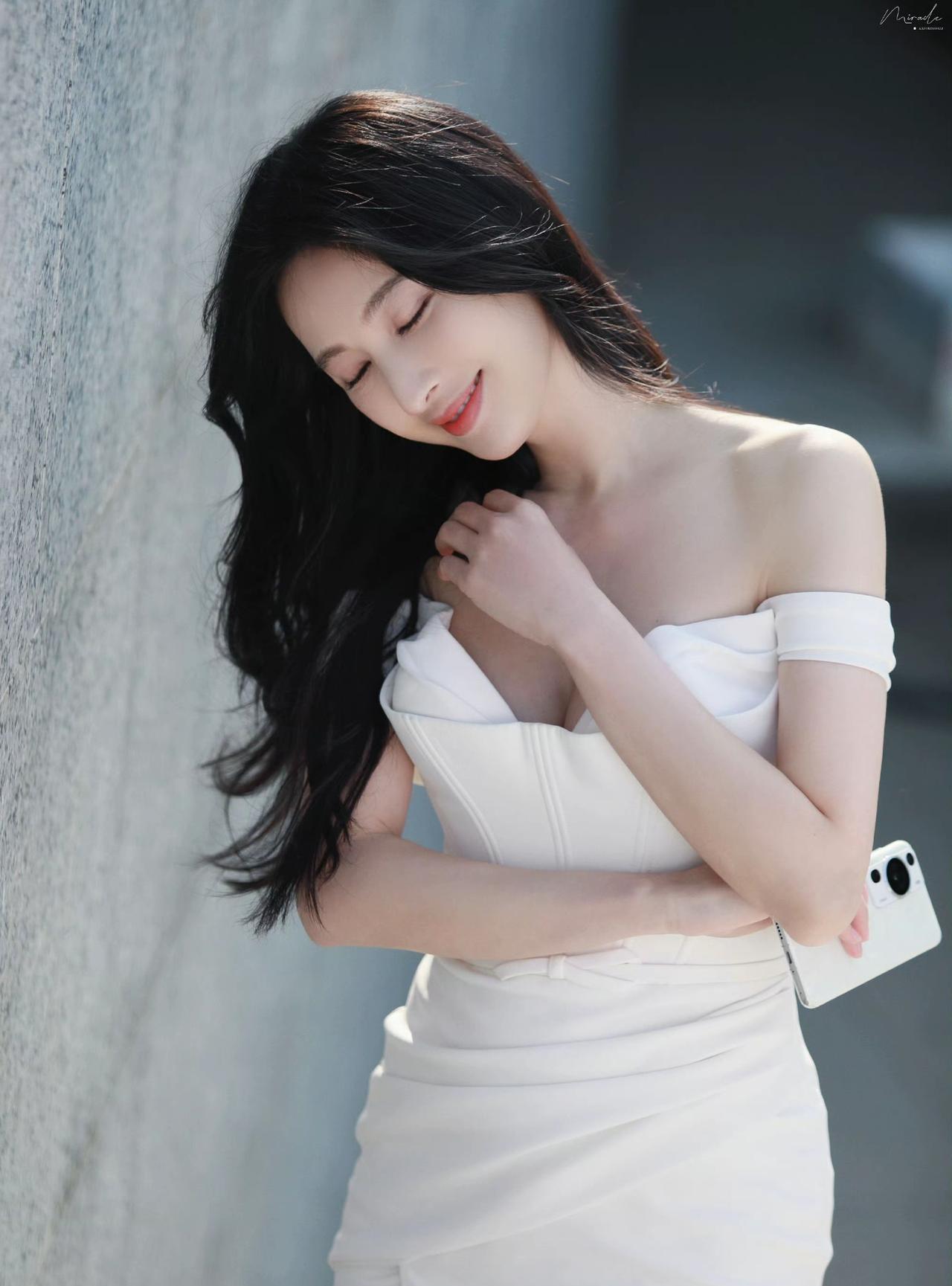 白裙似月光轻覆肩头,长发随微风漾起弧度,她握着手机,把眼前的美好与自身的优雅,一