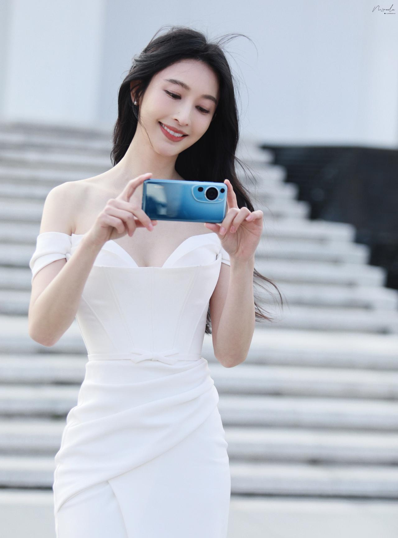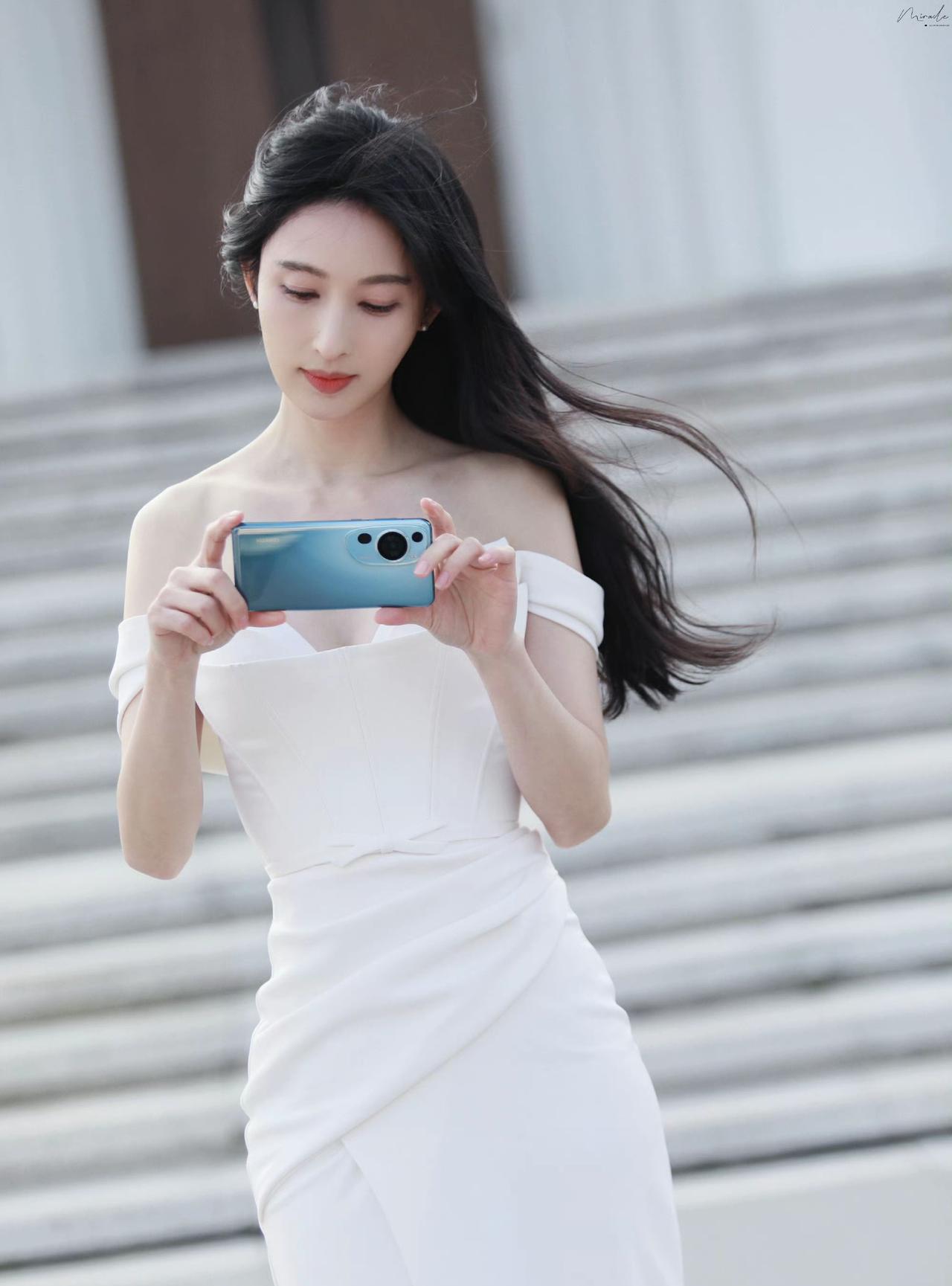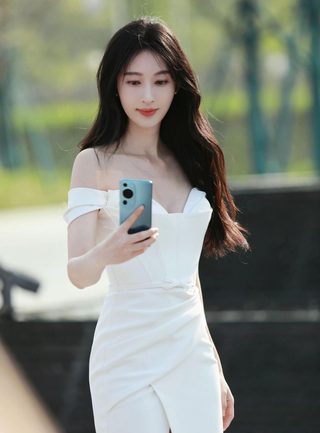 白裙似月光轻覆肩头,长发随微风漾起弧度,她握着手机,把眼前的美好与自身的优雅,一同框进镜头里。
