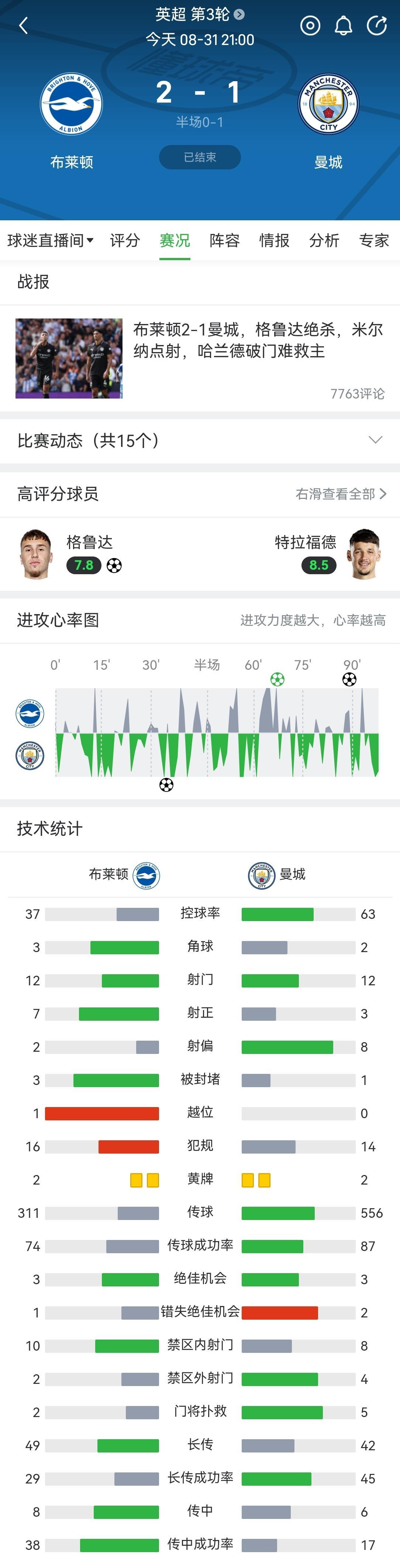 英超第三轮,曼城遭遇布莱顿。 曼城踢得很复杂,这是属于他们的足球,他们控球率63%。 布莱顿的风格很多时候其实和曼城有点类似,但这一场,他们踢得很简单——立足防守,快速反击,简单传递,用好长传转移。 两队都是12次打门,控球率只有37%的布莱顿7次射正领先于曼城的3次,为什么? 在快速反击,抓立足未稳的防线时,能够有更高的射门效率。 最后的结果是,简单的布莱顿以简单的攻击方式——后场断球长传,争第二点控制住皮球在快速行进中三脚简单的传递形成单刀破门。 这是一个绝杀进球,布莱顿2:1战胜了曼城。