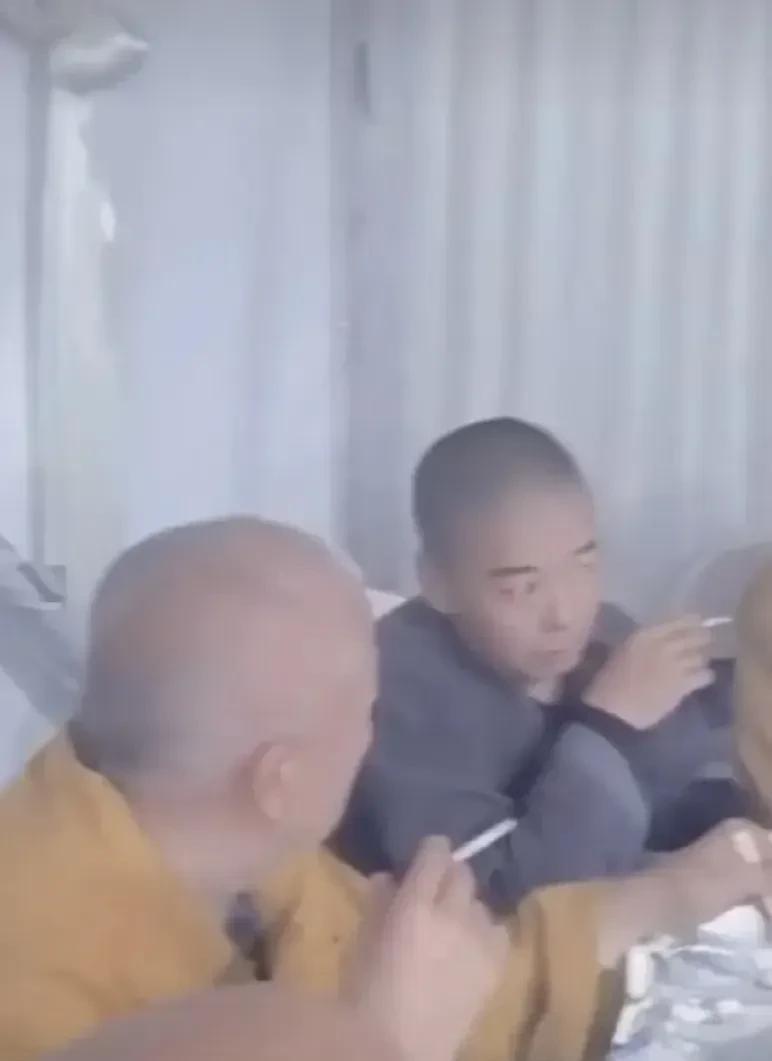 中午去饭店吃饭,遇到一桌和尚个个穿着袈裟光着头,端着酒杯推杯换盏,夹着香烟吞云吐