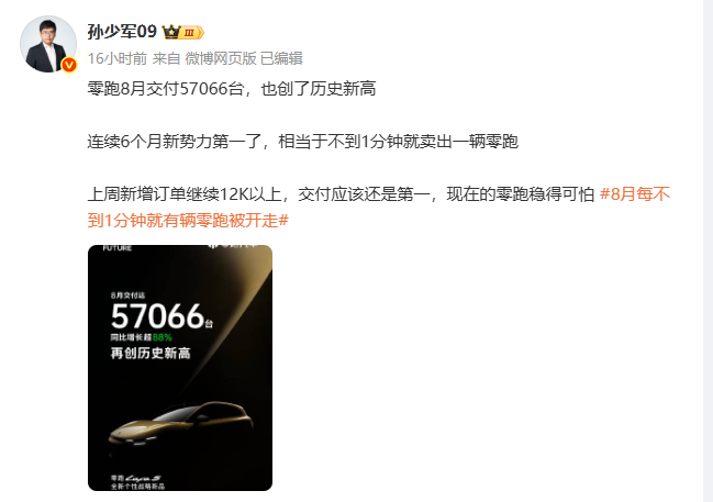 孙少军: 零跑8月交付57066台!