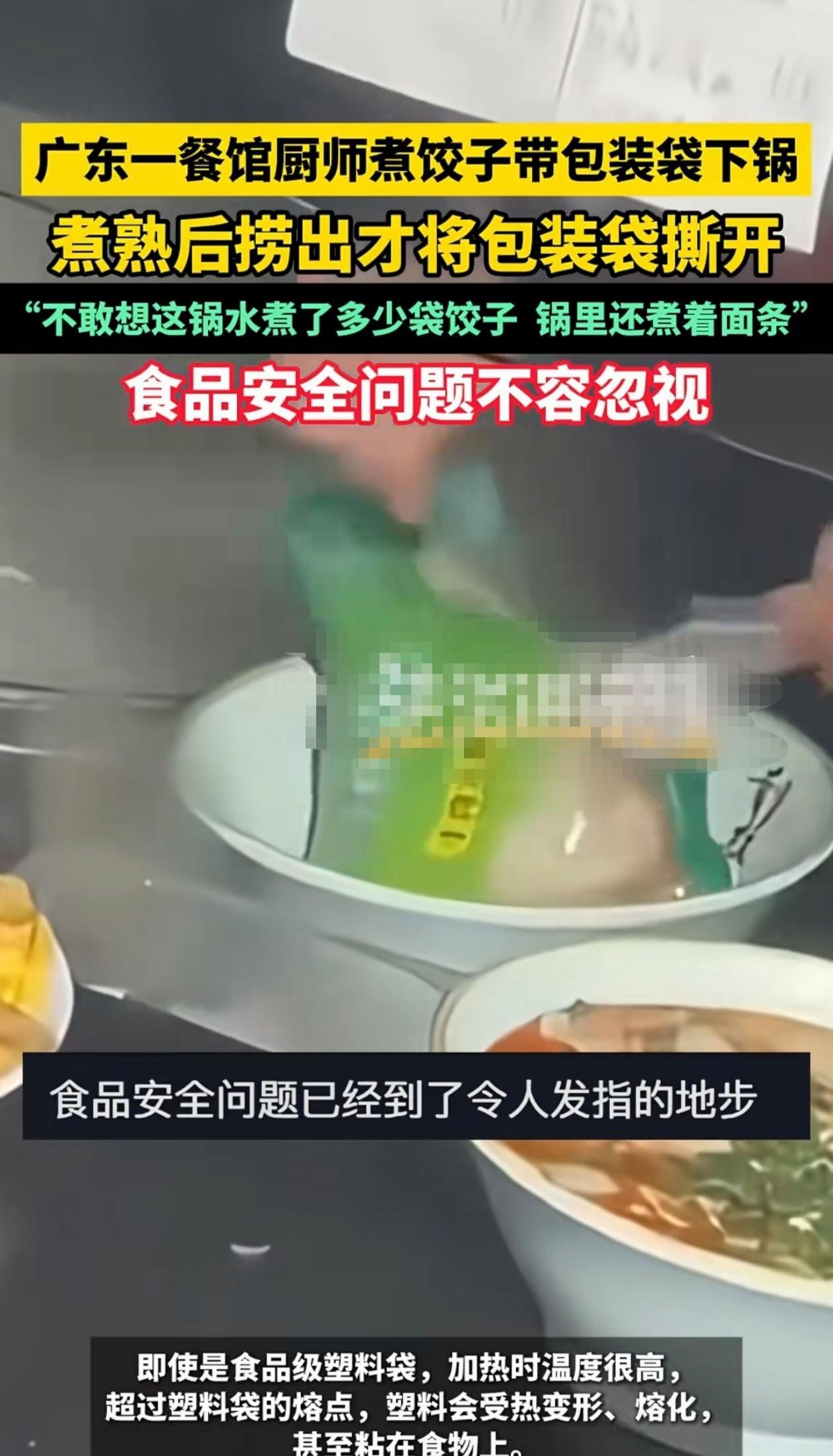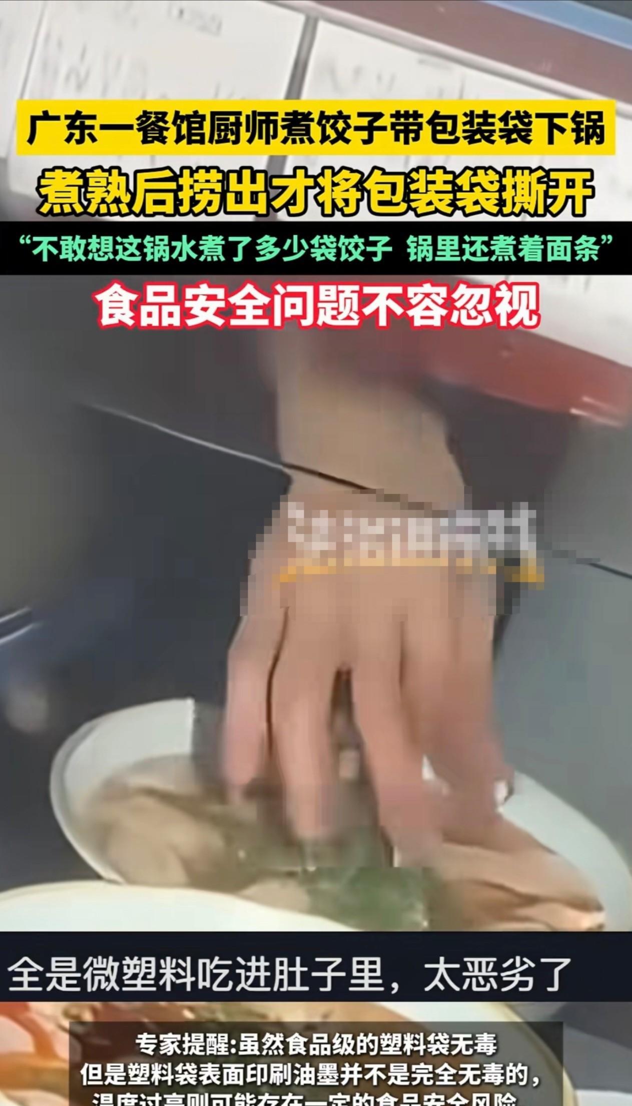 广东,一家餐馆的厨师煮饺子带包装袋一起下锅的事件引发关注。根据食客录制的视频所示