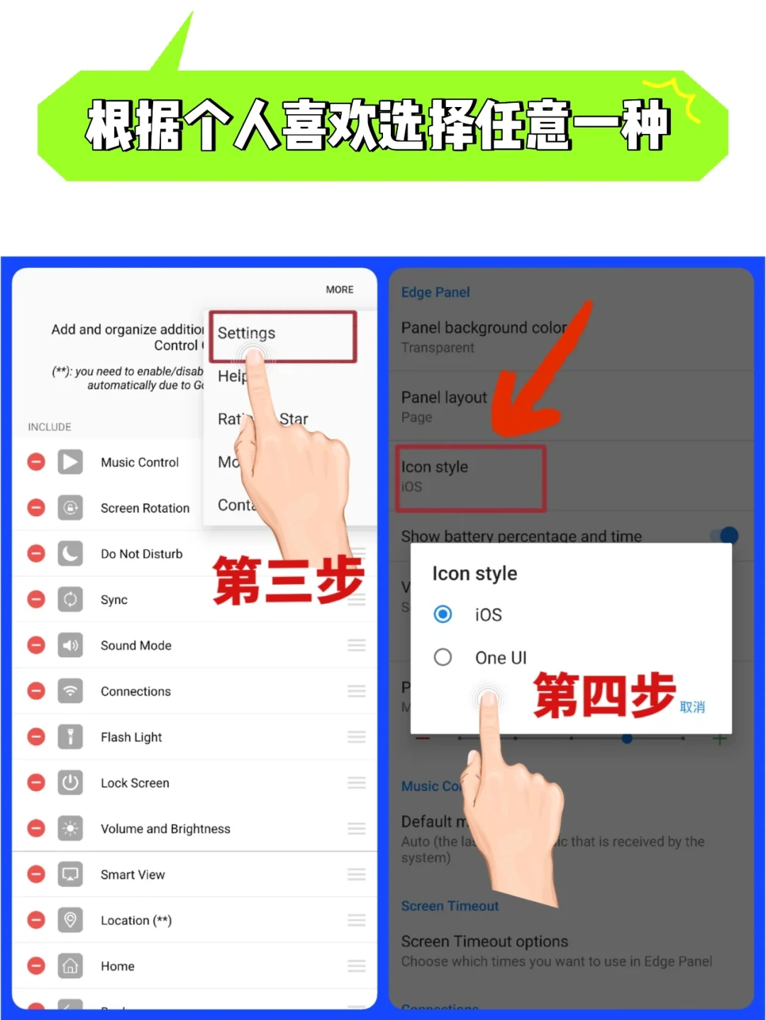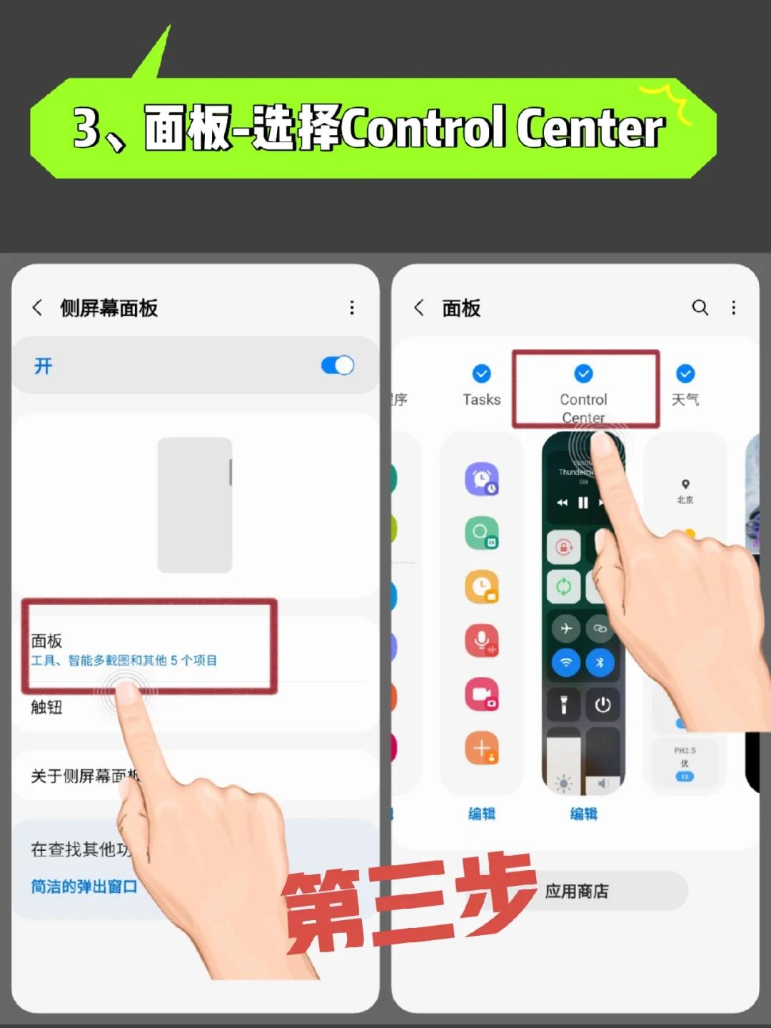 Hi、大家好,我是星球人小助手,近期很多小伙伴问图中的三星侧边栏风格怎么弄,今天给大家分享一下具体设置方法👉【建议收藏】❤ - 1️⃣收到后在三星S互传里面直接按好 2️⃣打开手机设置-显示-选择侧屏幕面板 3️⃣打开面板-进去选择Control Center 4️⃣左滑侧边栏就可以找到刚才面板 5️⃣目前支持2种面板风格,可根据自己喜欢的方式切换,具体步骤如图(5/6/7) -