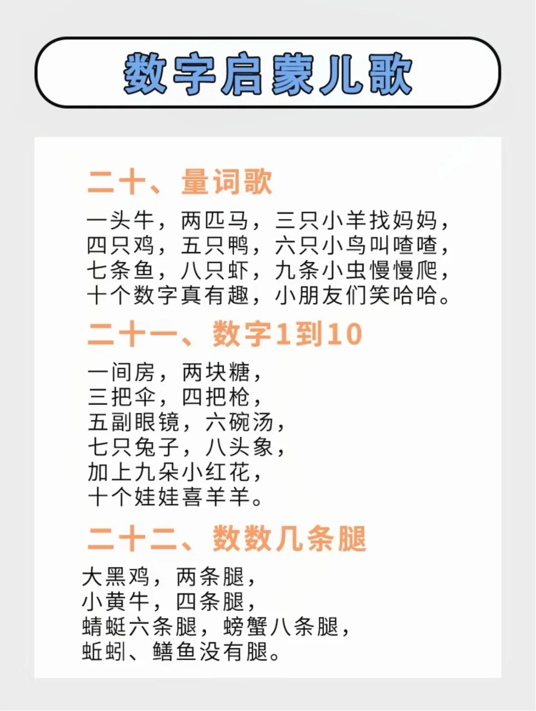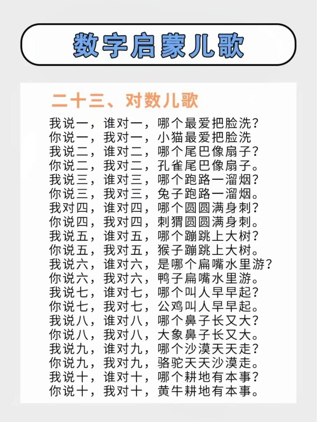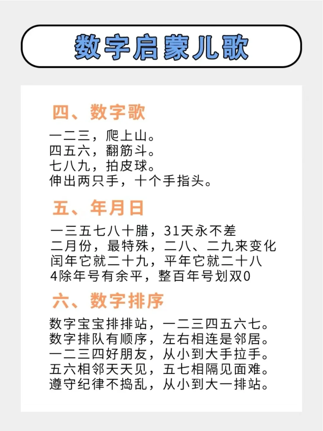 数字宝宝排排站,一二三四五六七。数字排队有顺序,左右相连是邻居。一二三四好朋友,从小到大手拉手。五六相邻天天见,五七相隔见面难。遵守纪律不捣乱,从小到大一排站。