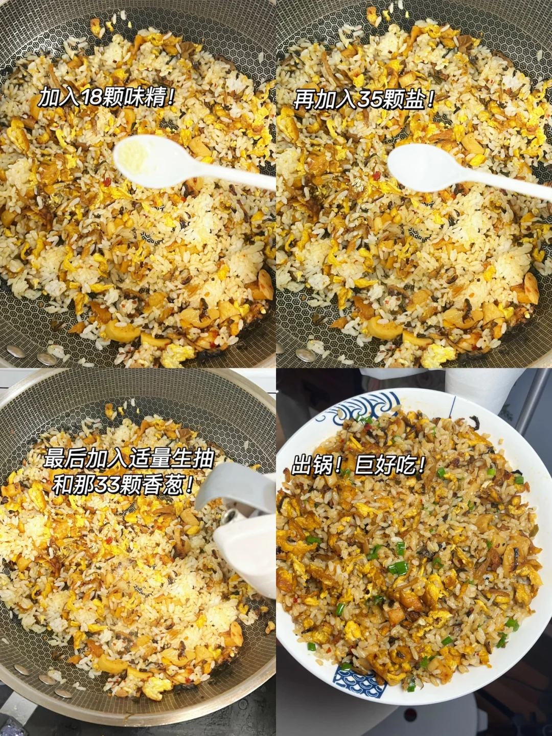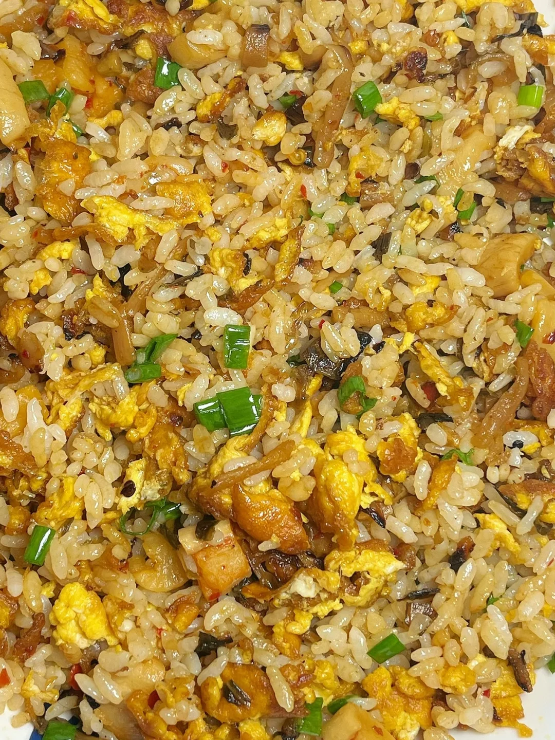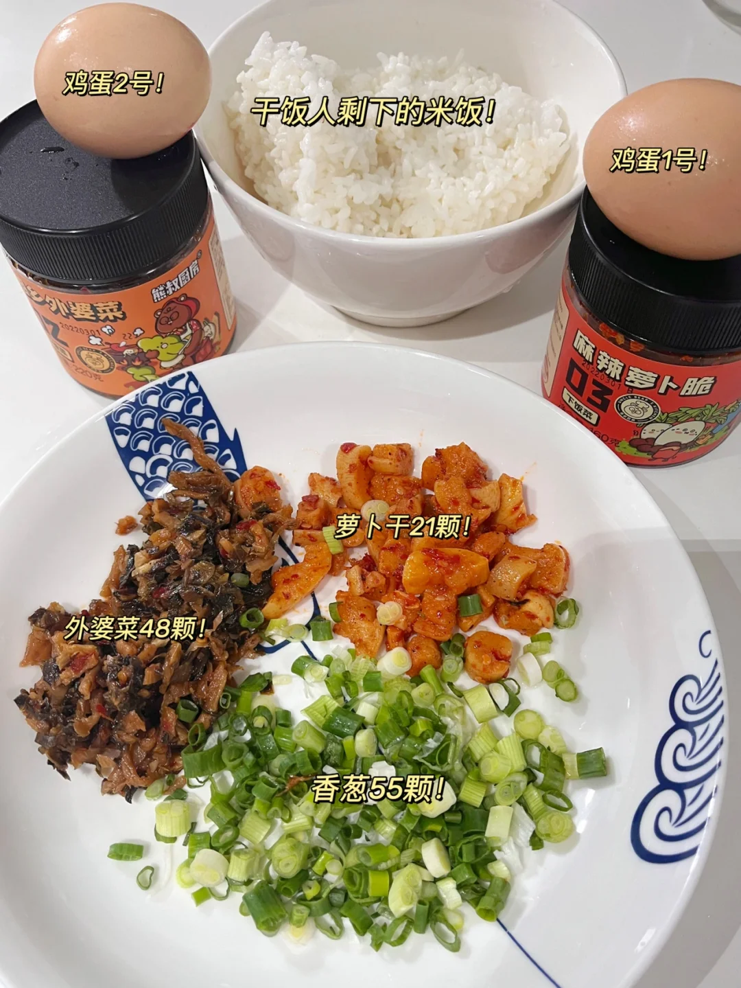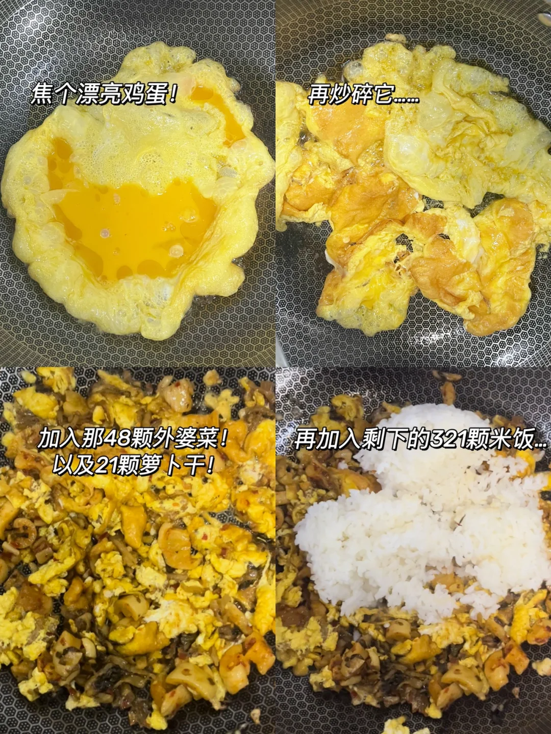 食材:米饭🍚!箩卜干!外婆菜!鸡蛋!香葱!味精!盐!生抽!