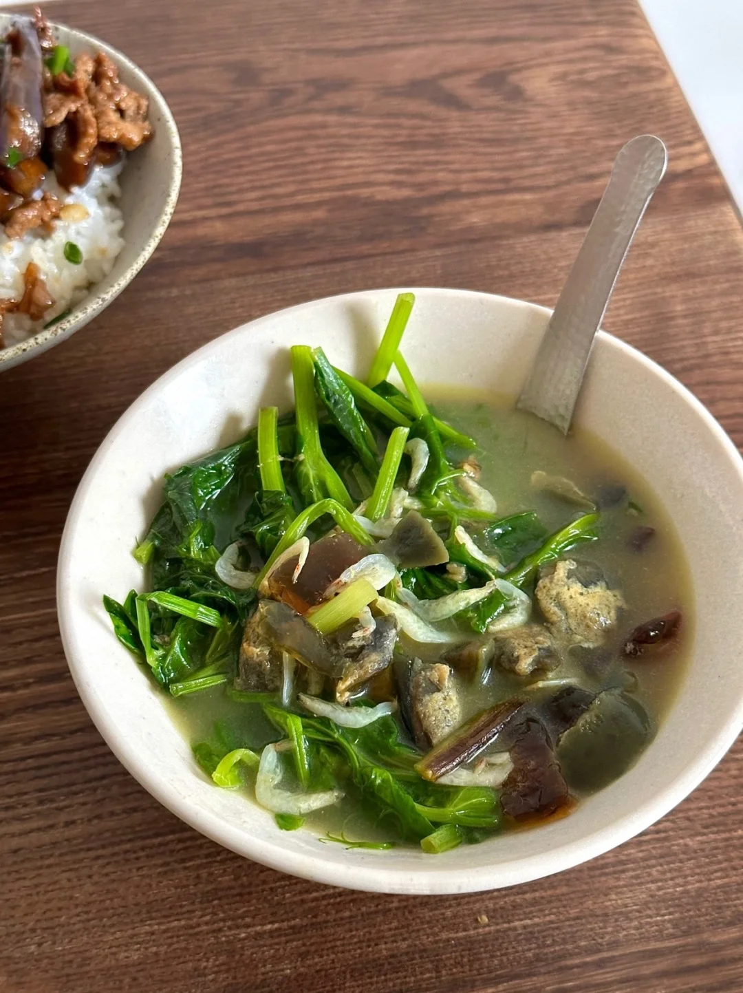 今日午餐:肉沫茄子盖饭,上汤豌豆尖