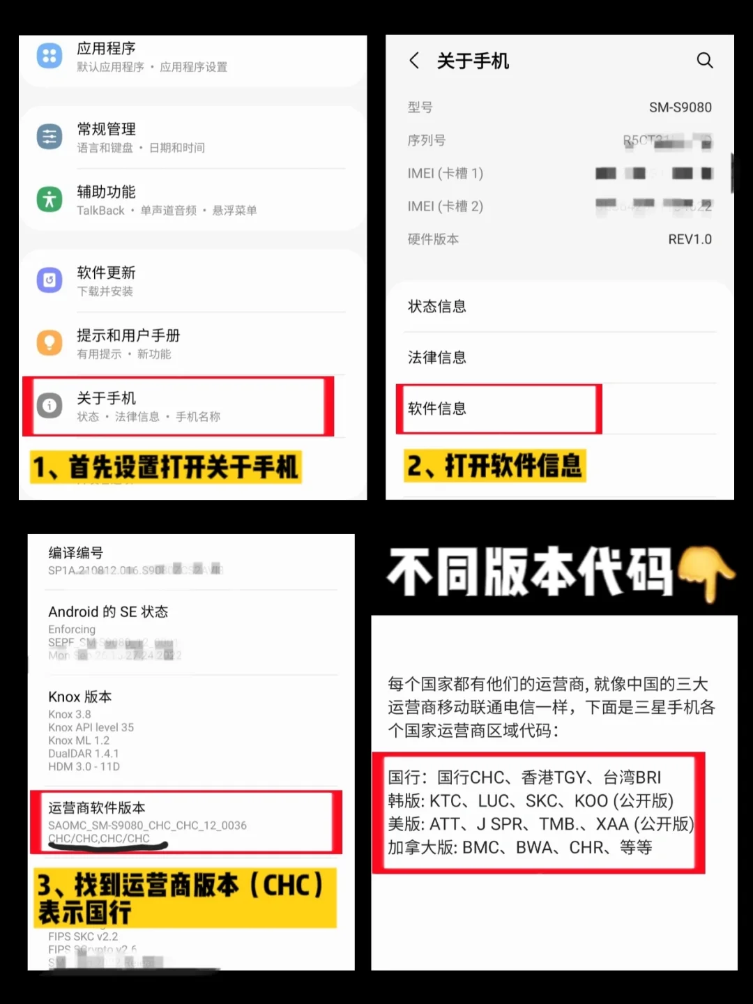1️⃣如何分辨一台三星手机属于国行还是外版及它的区域代码是什么?打开手机设置-关于手机-找到型号-看下型号后面倒数后一位数字是什么!