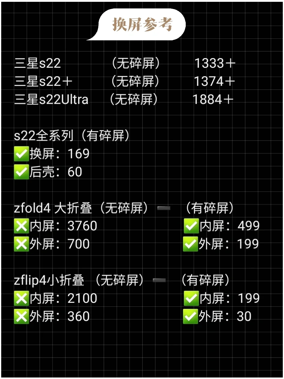 3️⃣三星手机有碎屏跟无碎屏换屏区别究竟有多大,我把近期几款热门机型的换屏价格放在图5了,大家可以看一下,觉得有用的朋友记得收藏❤