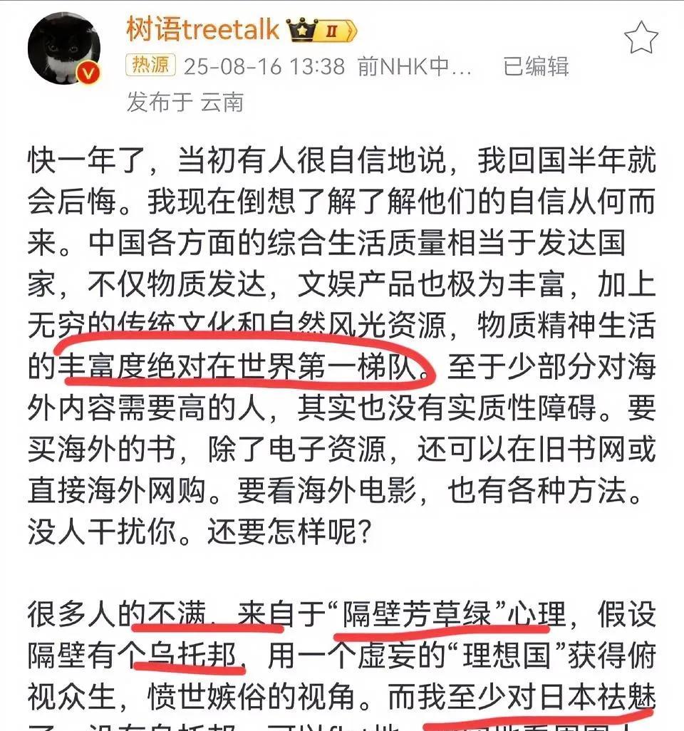 倒反天罡!中国籍主播宣称“钓鱼岛是中国的”,被日本法院判决支付1100万日元! 作为中国籍,去年胡越敢在日本电视台说“钓鱼岛是中国的,不忘南京大屠杀,不要忘记731”,就是个中国纯爷们!虽然日本法院近期要他赔偿1100万日元巨额罚款,但是完全可以不予理会了! 22秒在异国他乡捍卫了民族尊严,长达22年的NHK工作生涯中断他也没有后悔,他只不过是尊重历史,说了22秒的真话而已,就要被解雇,更要被法院判罚1100万日元的罚款,到底谁心里有鬼一目了然! 半个月前,胡越回应了此前一直断言他“回国就会后悔”的人,用有理有据驳斥了这种言论,表示自己早已经对日本祛魅。在日本生活20多年还有如此三观,真正的人间清醒。