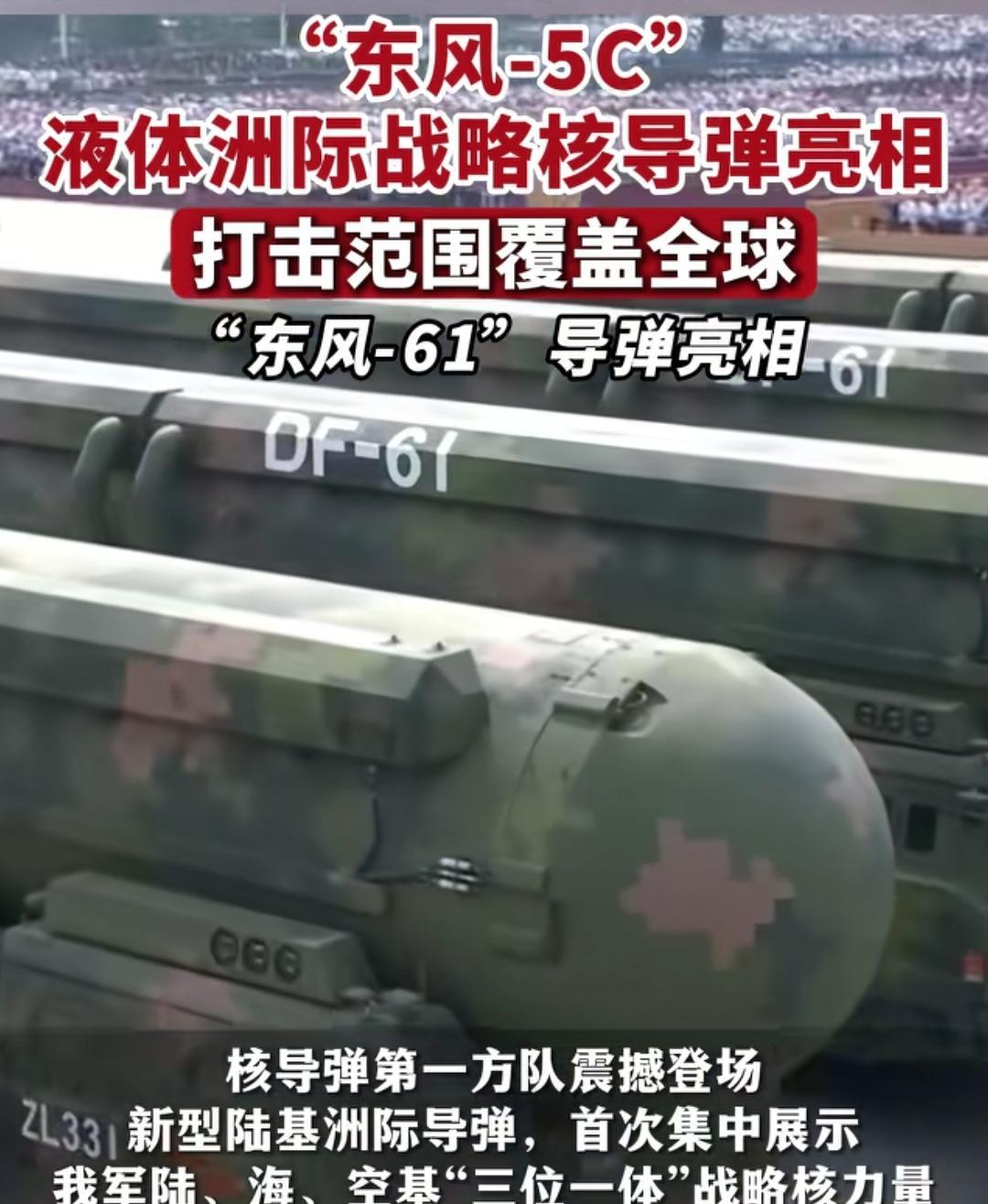 这次阅兵式真的吓到我了!以前都不拉弹头出来的。这次展示了东风61和东风5C核弹头是我万万没想到的。 这两款大杀器主打一个覆盖全球,威慑全球。 科普一下:DF—5C是分体运载的,所以很多观众都没看懂,心里想问:为啥看到的就是一个圆柱体和一个大胖墩外加一个“核弹头”? 所以你们知道为什么分成3段吗?因为合并在一起会很吓人。而且也没有这么大的车来运载。[偷笑] 其实东风5C是发射井用的,这次单纯是拉出来亮亮。