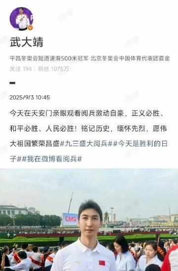 孙颖莎看阅兵感想,体育健儿被阅兵鼓舞 九三盛大阅兵的场景,鼓舞着运动员:@王楚钦___ :响彻云霄的口号、整齐划一的步调、震撼人心的轰鸣,都是历史与未来碰撞的回响。 @孙颖莎 :看到如此盛大的纪念大会,我相信每一个中国人的心中都会非常自豪。我们要在各自的领域努力发光发热,不断创造新的胜利,为强国建设、民族复兴作出自己新的贡献。 @郑钦文Ana :作为一名中国运动员,我既是奋斗的拼搏者又是时代的见证者,这份荣耀将永远激励我为国争光。 @苏炳添 :现场观看阅兵那感受非常震撼,铿锵有力,威武雄壮,中华民族伟大复兴势不可挡,伟大祖国繁荣昌盛。 @潘展乐 :每一步都踏在心坎上,这盛世如我们所愿!祝伟大祖国繁荣昌盛! @巩立姣 :铭记历史,缅怀英烈,这种精神与力量将激励我在今后的训练和比赛中,更加奋勇向前,为祖国赢得更多的荣誉! @女足王霜:感恩时代赋予我们的一切,让我们在自由和平的时代中追逐梦想[ @武大靖 :今天在天安门亲眼观看阅兵激动自豪,正义必胜、和平必胜、人民必胜!铭记历史,缅怀先烈,愿伟大祖国繁荣昌盛 @Eric-林高远 :当挂满勋章的老兵摇动红旗,新型装备列阵而过,有种难以名状的震撼与感动。 @举重李雯雯 :中华民族伟大复兴势不可挡!人类和平与发展的崇高事业必将胜利! 陈清晨 @陈小白BAOBAO :这是我一辈子都难忘的回忆。祝祖国繁荣昌盛 祖国万岁!我爱我的祖国 @陈梦-乒乓球 :敬畏 期待 一起见证! @击剑孙一文 :愿以寸心寄华夏,且将岁月赠山河。努力发光 以吾辈之青春 捍卫盛世之中华!(央视新闻)