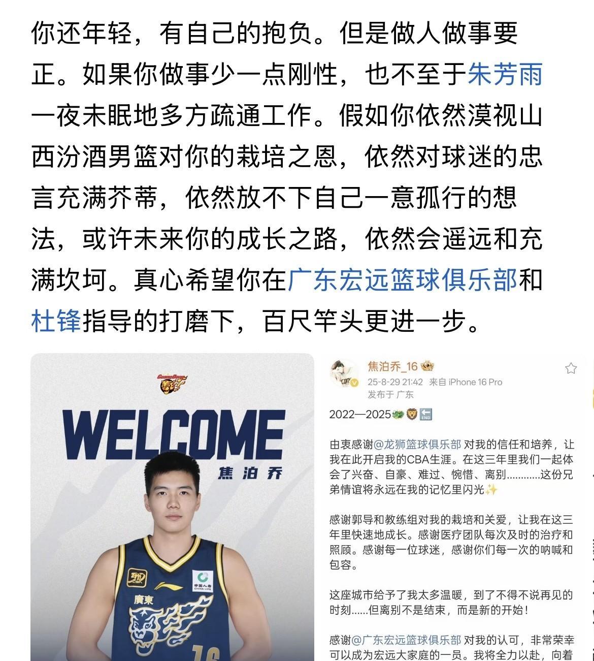 这种文章逻辑真的一言难尽,完全是“绑架式感恩”。青训是青训,职业是职业,培养和雇佣关系清清楚楚,谁也不欠谁一辈子。焦泊乔能走到今天,靠的是自己能力和选择,而不是必须终身“跪谢”某个俱乐部。离队是职业发展的一部分,哪支队伍也没资格要求球员为“情谊”牺牲前途。 动不动就拿“恩情”“父子情”说事,本质还是想把球员拴在原地,把青训变成道德枷锁。球迷若是真心祝福,就该尊重球员的决定,而不是酸溜溜地把选择解读成“忘恩负义”。 所以回敬一句:职业篮球看的是实力和契机,不是跪在原地的感恩词汇。尊重球员的选择,就是对这项运动最大的尊重。