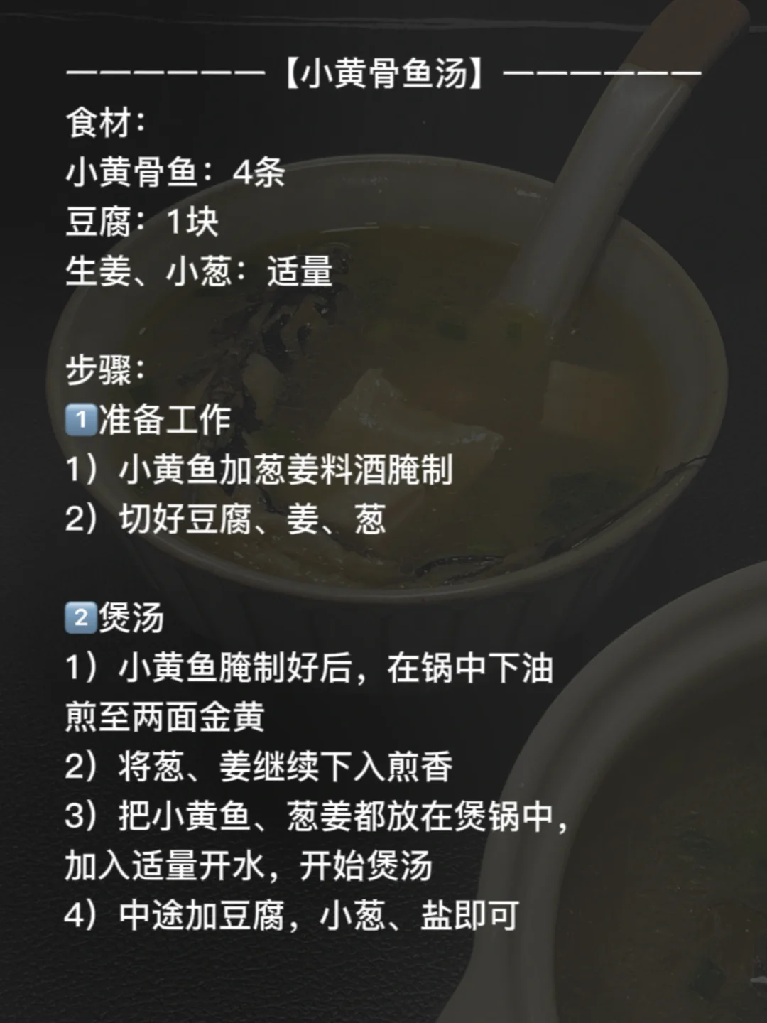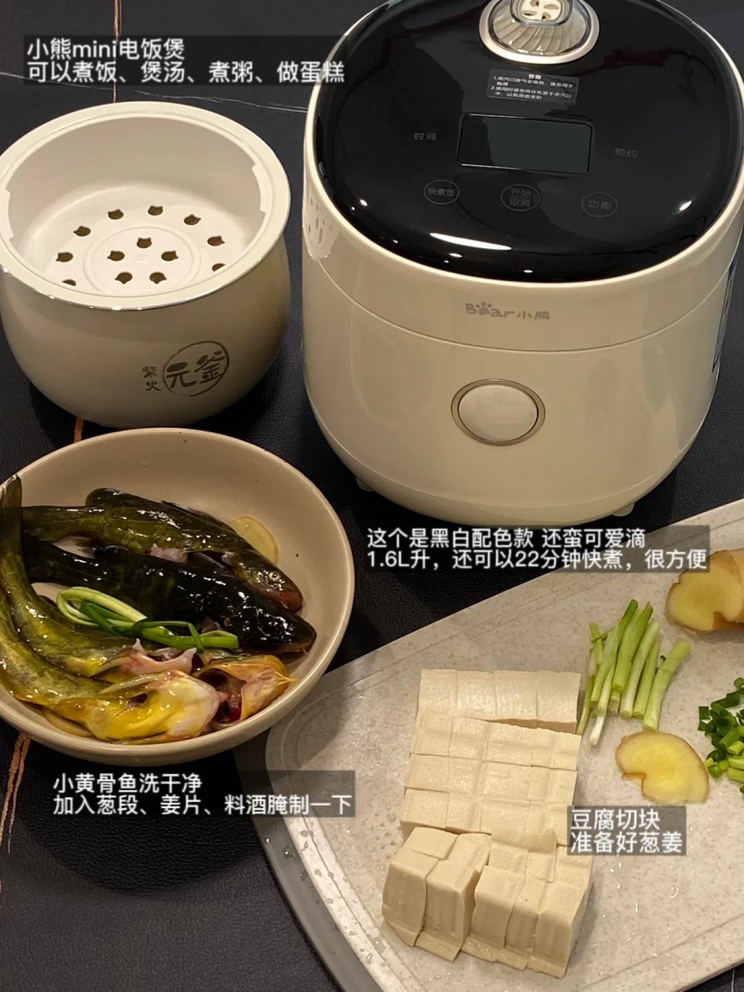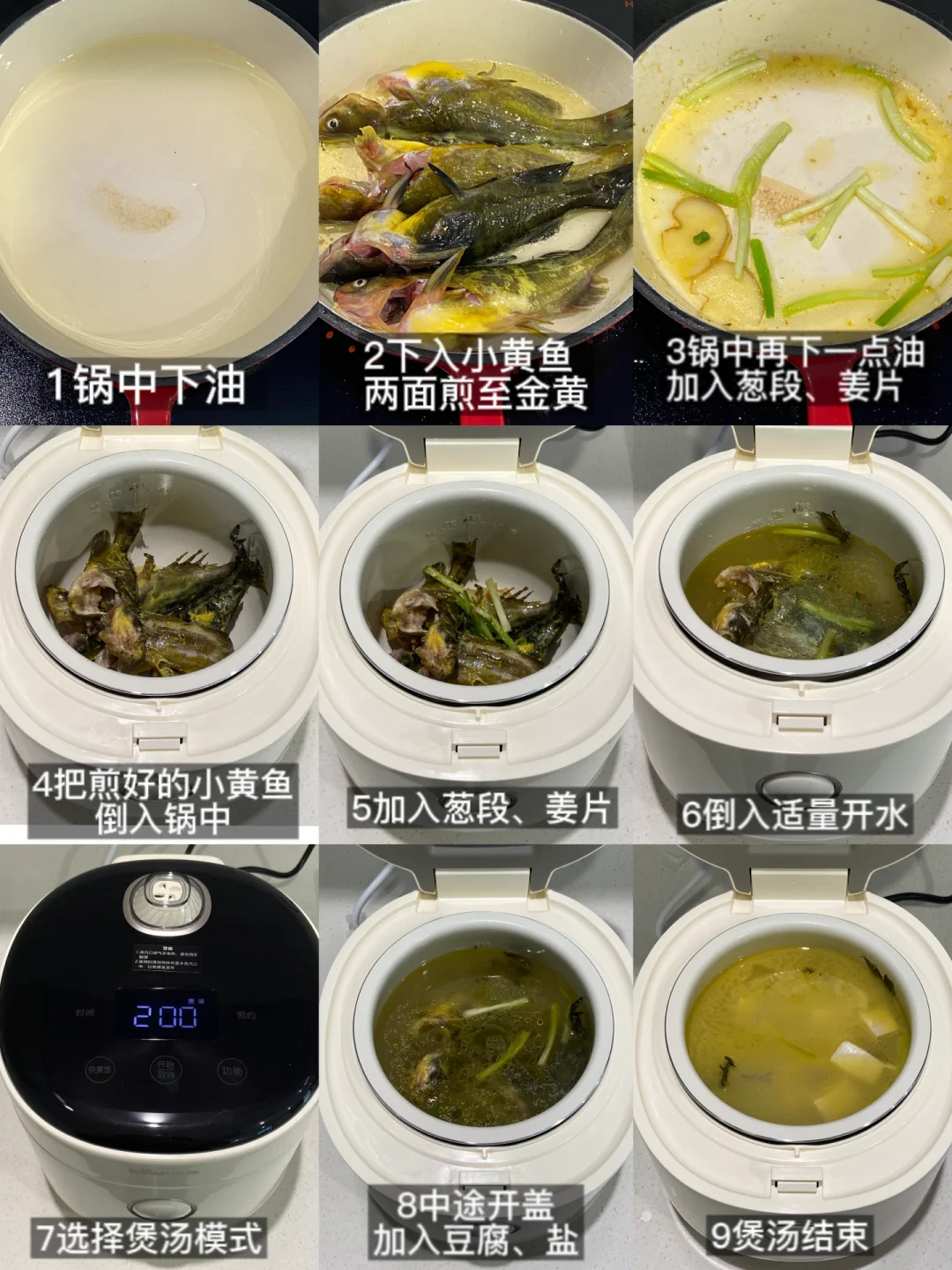 菜谱在p7 黄骨鱼汤很好喝滴,这个鱼也是基本没有刺,很嫩,推荐 奶白汤要点 先把锅中油烧热——烧热后冷却一下锅再开火起锅——下入小黄鱼煎制 tips: 1⃣️小熊二人食mini电饭煲功能比较多,煲汤是定时2小时,可以酌情增减时间,基本上鱼汤呈奶白色即可,撒一点葱花很好喝