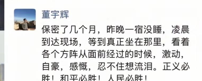 董宇辉失眠的原因找到了!原来他竟然是为了这个保密好几个月。难怪经常睡不着[笑][笑] 今天董宇辉受邀观礼93阅兵,在现场看着各个方正在面前经过的他,难掩激动的心情,发了七条视频,眼里心里全是对祖国对人民对军队的热爱。他还不忘在现场高歌一曲《歌唱祖国》。 观礼结束之后,更是接受了几大媒体的采访,在这其中还有最具权威代表的新华社。 已经不记得这是新华社记者张扬第几次采访董宇辉。 印象最深刻的还是他们一起在宁夏录制的节目《向新而行》。 话说宇辉也真够忙的,各种采访各种节目邀约不断。且全部都是官媒。前些天不是还出现在广西玉林与央视节目主持人龙洋录制《山海寻味》的吗? 没想到刚过几天,竟然受邀观礼九三节目阅兵。能观礼九三阅兵的人,都不一般吧?由此可见国家对他的认可程度。 董宇辉在评论区说这件事情已经保密几个月了。前天晚上太兴奋,没睡着,凌晨就到达现场了。 网友说:这孩子长大了,这么重大的事情,居然能保密好几个月,难怪经常睡不着。 可不,这是多重大的事情。压在心里头不难受吗?好担心把他给憋坏了,昨天终于痛痛快快的发了七条抖音。 看着他那张棱角分明,方方正正的脸,我在想:董宇辉,也是能成大气之人,要不然怎么能保密几个月呢?[我想静静][我想静静]