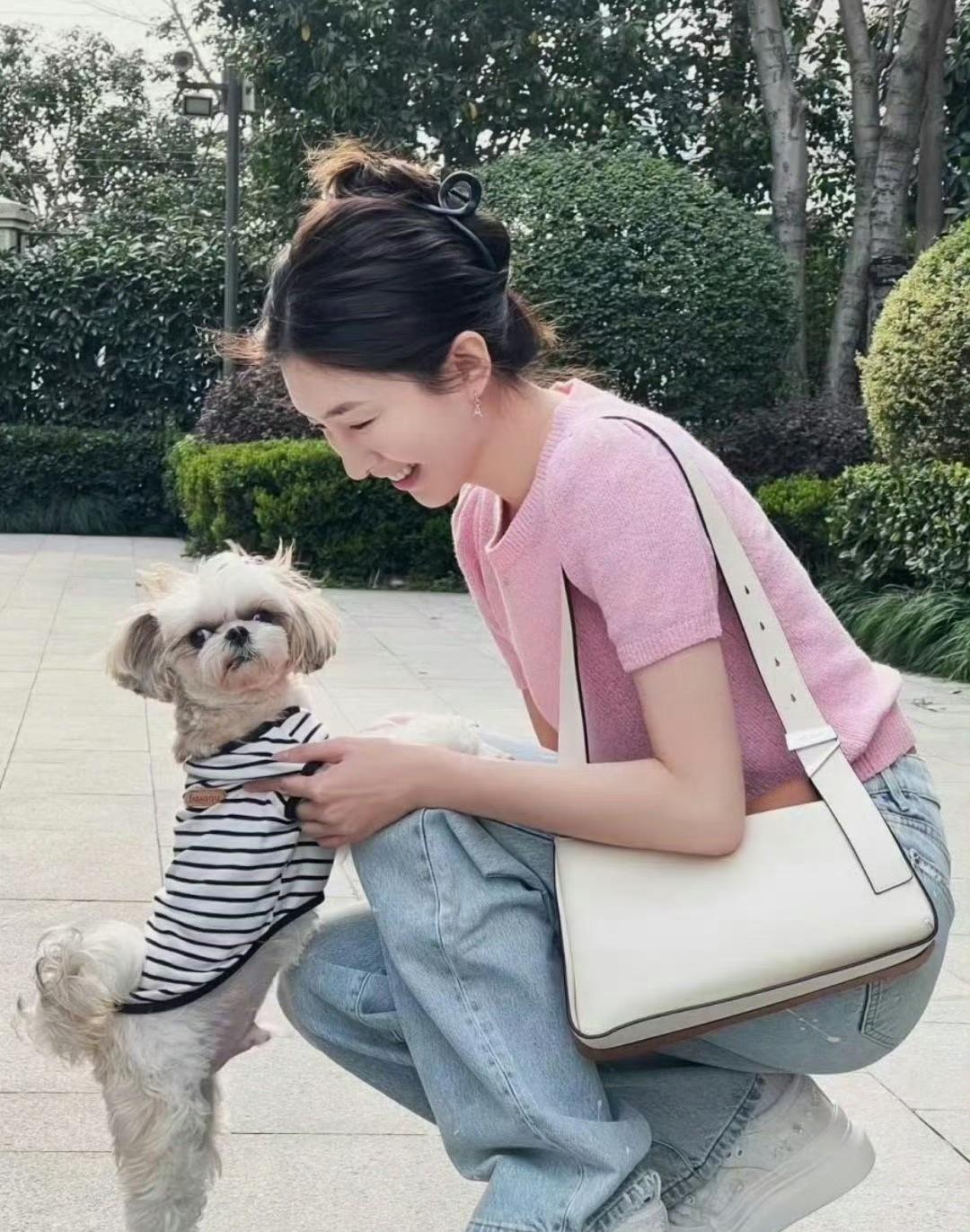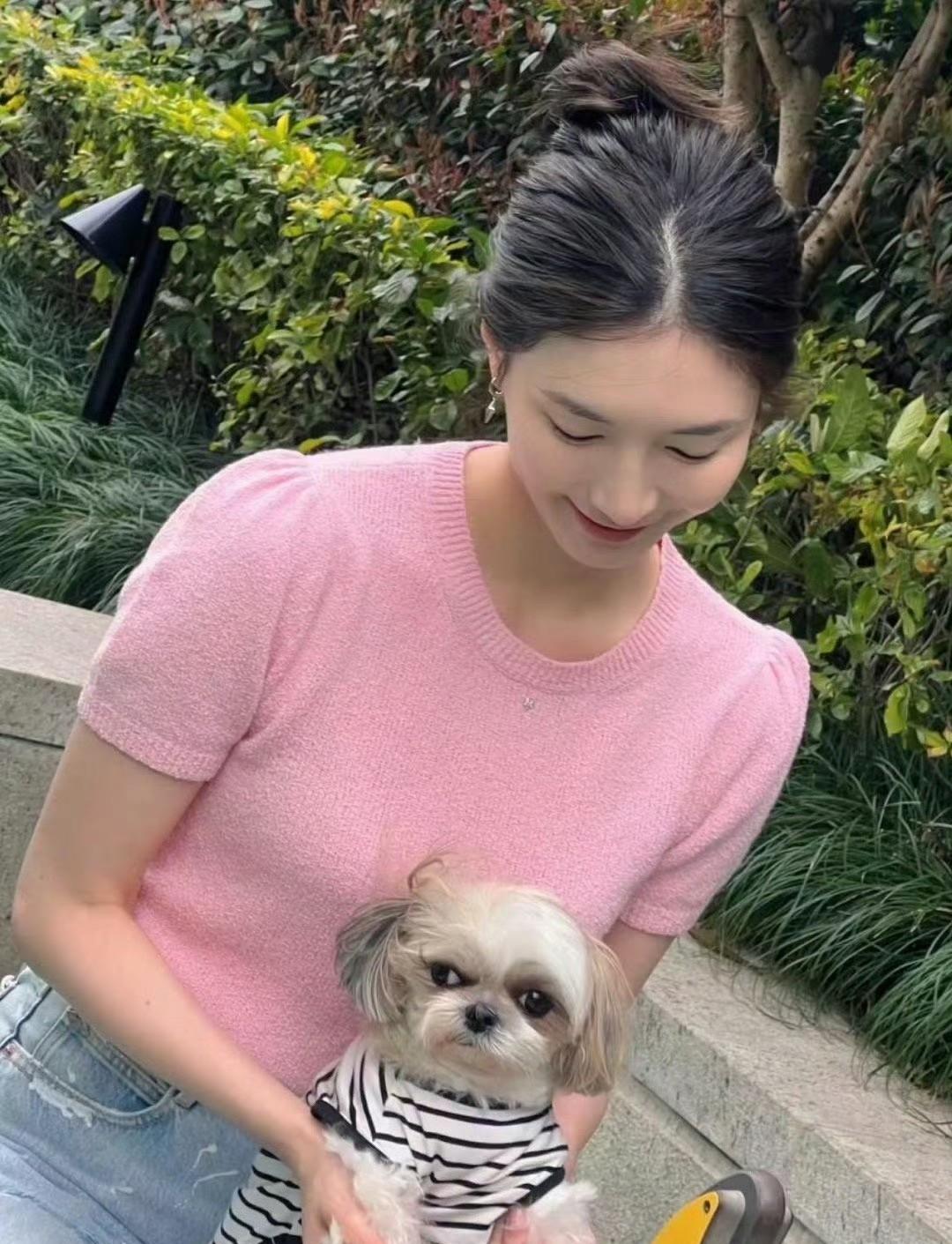 江疏影和小狗的合照,江疏影的鼻子偏长,导致脸部中庭长,所以长相偏成熟,总有一种港女的感觉。