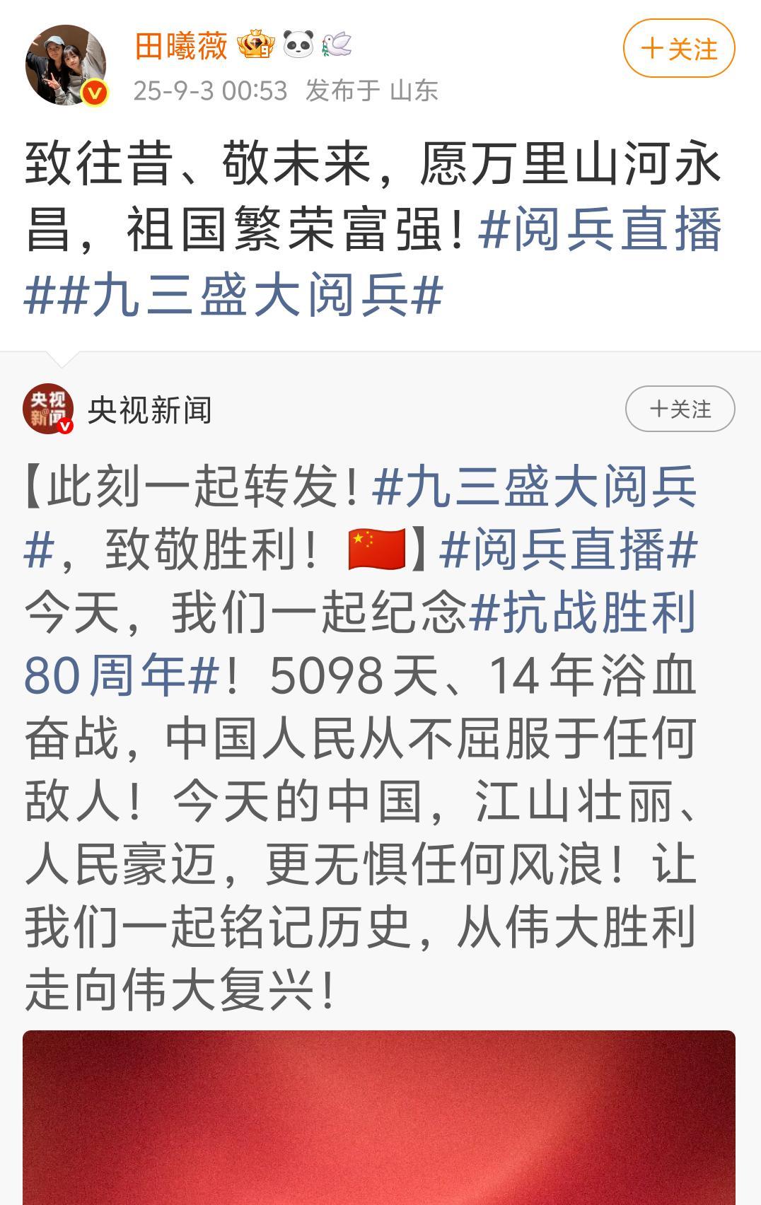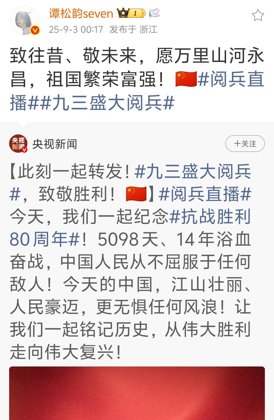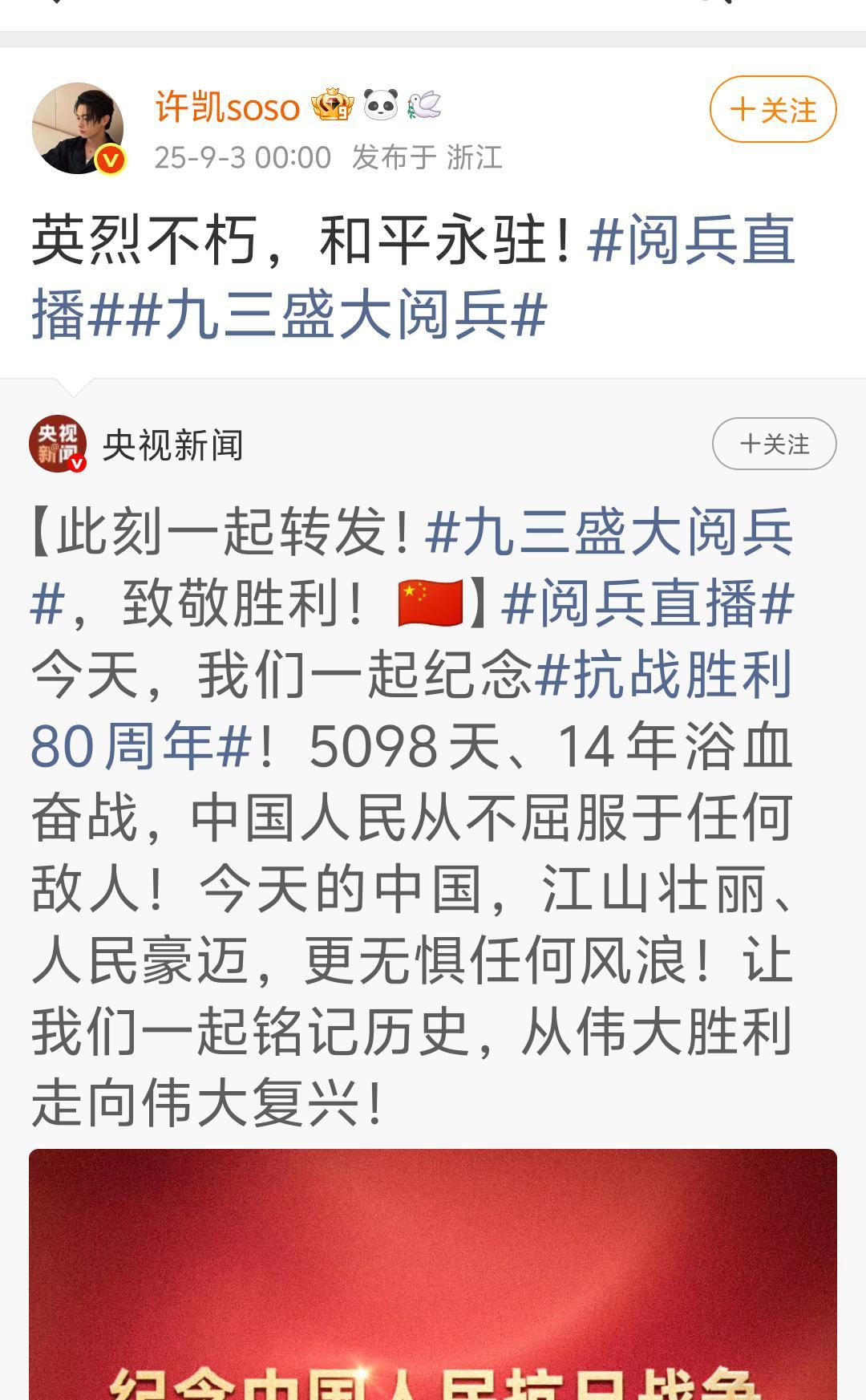 以下三位明星晚上都不睡觉吗?都是凌晨转发的央视新闻,九三盛大阅兵现场直播! XK